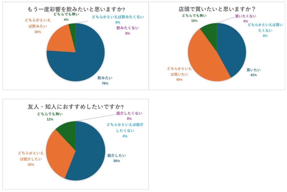 彩響を楽しんだお客様にアンケートを実施し「もう一度彩響を飲みたいと思いますか?」という質問には96%の人が「飲みたい※」と回答するなど、非常に高い評価を得ました。※「飲みたい」「どちらかといえば飲みたい」の合計
