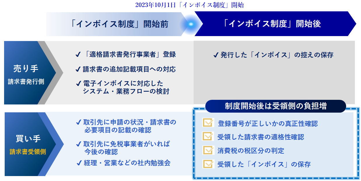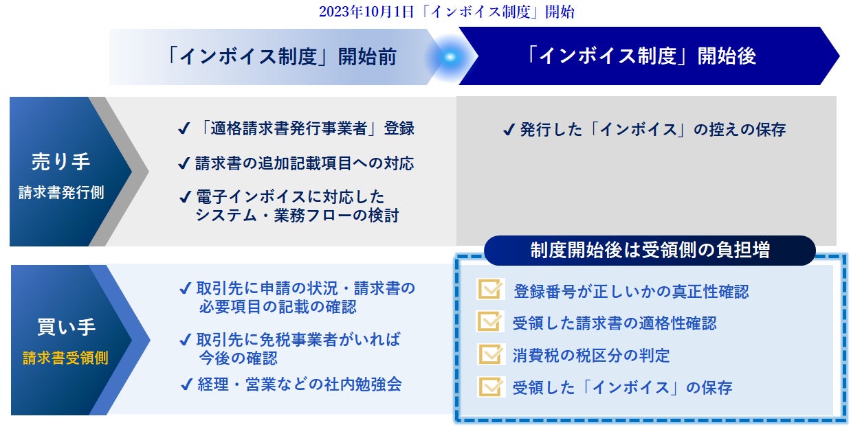 一方、インボイス制度開始後は、「請求書の受領」側は仕入税額控除を受けるために、新たな記載事項である適格請求書発行事業者の「登録番号」が正しいかどうかの確認や、インボイスの要件を満たしているかの確認、および消費税額の計算などを行う必要があり、経理業務の負荷が上がることが予想されます。