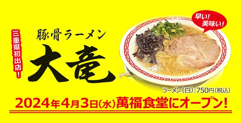 【元祖泡系博多一幸舎】プロデュース「豚骨ラーメン大竜(だいりゅう)」が2024年4月3日(水)三重県津市に二毛作営業の店舗としてグランドオープンしました!