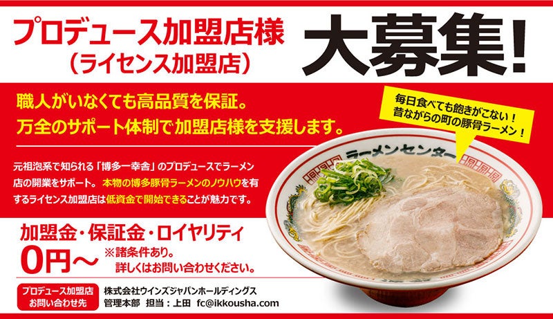 加盟店募集において、『加盟金・保証金・ロイヤリティ 0円〜(諸条件有り)』とし、ラーメン事業に取り組みたい方々が開業を実現しやすいパッケージとしております。店舗では職人に頼らずクオリティの高い商品提供が可能です。これは、麺やスープなどの食材を、自社グループ内の工場で熟練した職人の手により、一括生産することでコスト削減を行いながら、店舗では職人に頼らず一定の商品品質を保つことができます。また、創業より「博多一幸舎」がこれまで培った経験をもとに厨房設計、機器、各種備品などについても、顧客満足はもとより、従業員の利便性や経営効率など幅広い視点でのアドバイスを提供いたします。