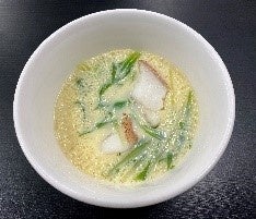 豆腐とスジアラのすり身で作った豆腐真丈。和の技法を取り入れました。小松菜やニンジン、しいたけが彩りを添えています。ふんわりとした食感の豆腐真丈と、とろみのあるスープはほっとする味わいです。