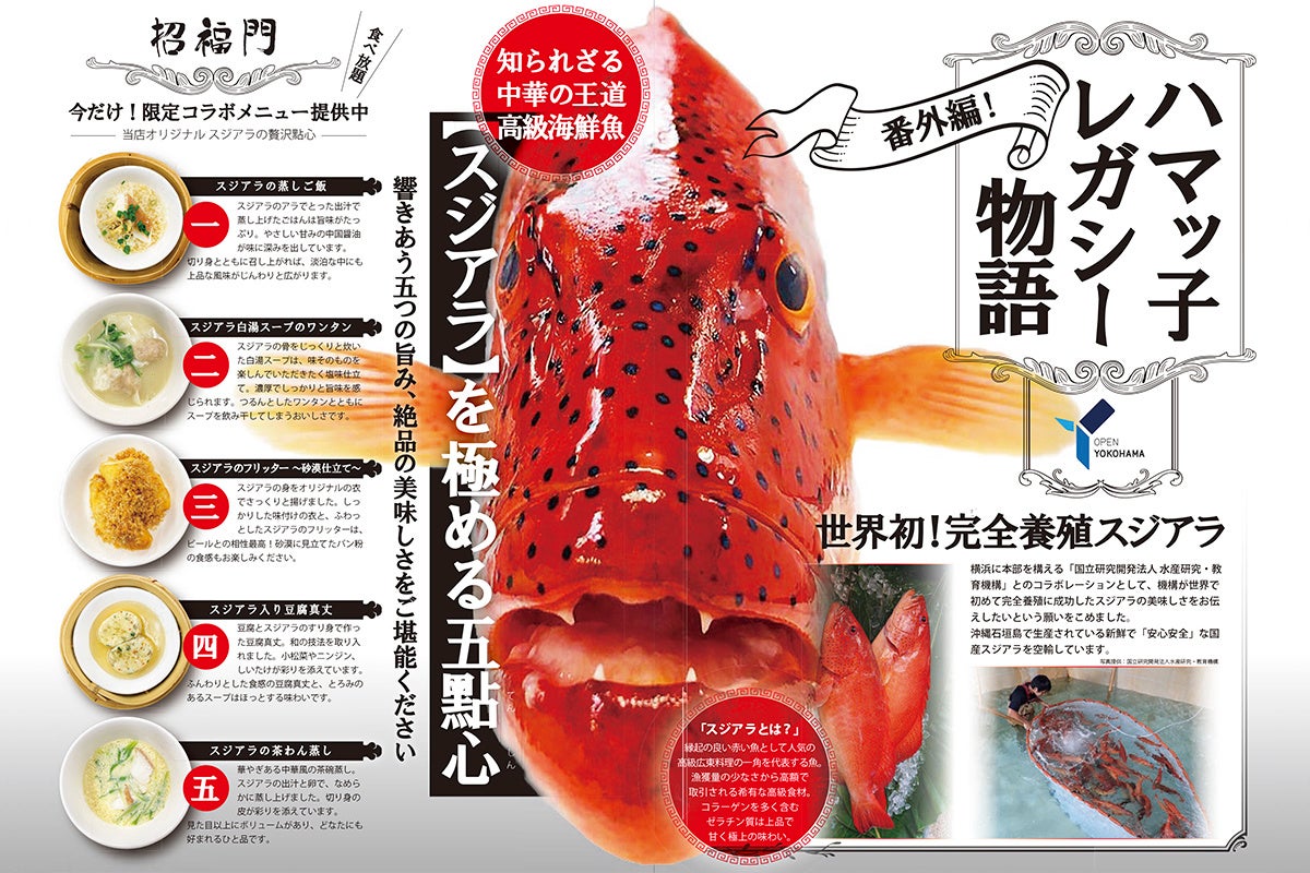 国立研究開発法人水産研究・教育機構(本部・横浜市神奈川区)が世界で初めて開発した、完全養殖の高級魚「スジアラ」を使用した限定コラボ点心5種を数量限定で提供します。大きな魚一匹まるごと活用した多彩なメニューを当店の香港飲茶食べ放題でお楽しみみいただけます。
