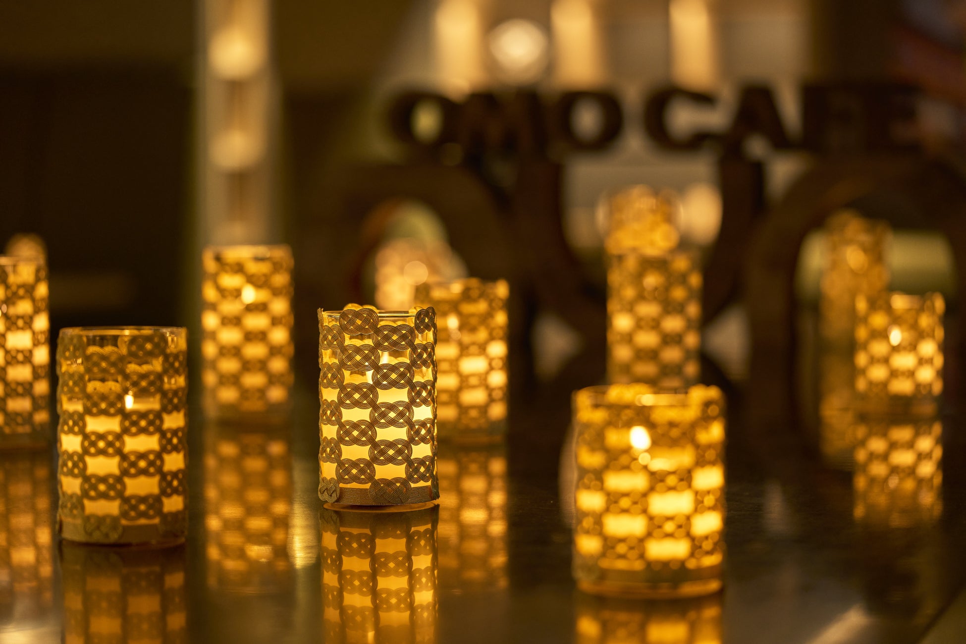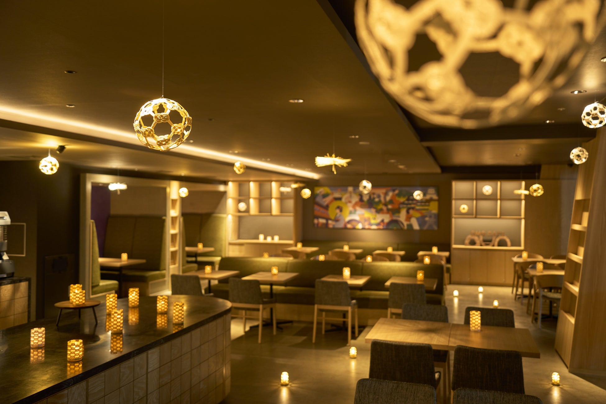 ナイトタイム限定でOMOカフェが水引で彩られた空間に変身します。装飾は、水引の伝統的な結び方「あわじ結び」と、加賀水引の特徴である立体的な作りを活かしたデザインです。例えば、天井には、松竹梅をモチーフに、水引の影が美しく映し出されるように結び方を工夫したくす玉を吊り下げ、テーブル上には、あわじ結びを連ねたデザインで、あかりのゆらめきも感じられる行灯を設置します。また、床にも行灯を配置して、足元や壁面の低い位置にも水引の影がくっきりと映るようにしました。水引を飾るだけでなくあかりで灯すことで、空間全体に水引の影が映し出されます。まるでOMOカフェが水引で包まれ結ばれているような、幻想的な空間になり、しっとり落ち着いたナイトタイムを演出します。
