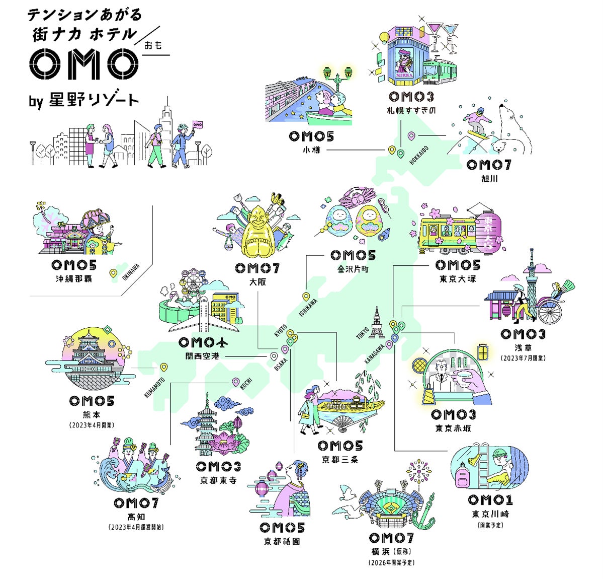 「OMO」は星野リゾートが全国に展開する「テンションあがる『街ナカ』ホテル」。地域と一体となって街を楽しみ尽くす旅を追求しています。全てのOMOで、街歩きをサポートするサービス「Go-KINJO」を展開。全国各地の14施設から都市観光の楽しさを発信していきます(2023年4月時点)。