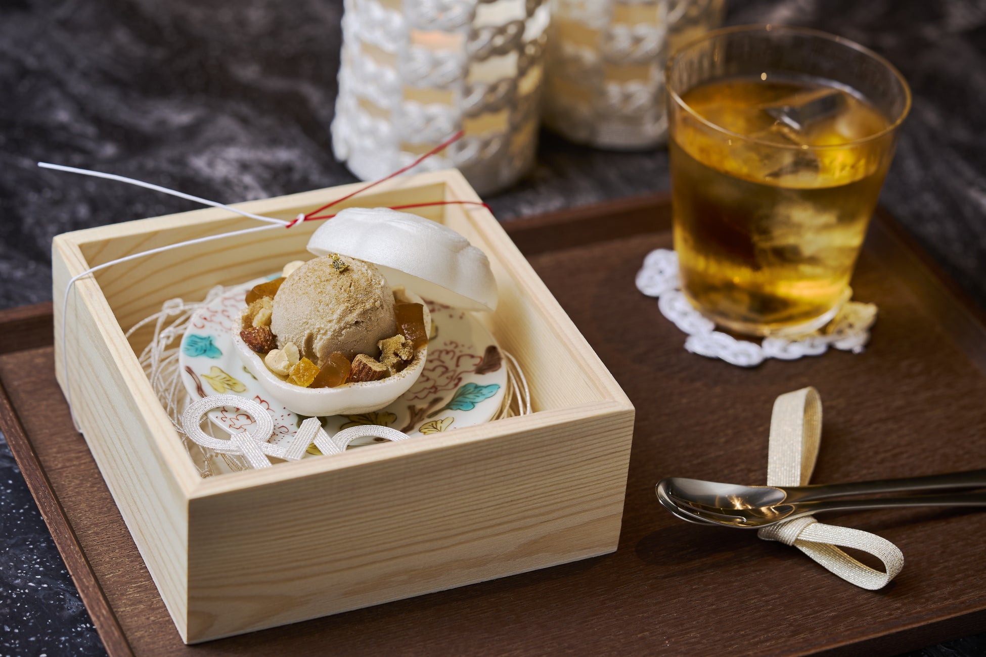 一世帯当たりにおける菓子類の年間支出金額が全国 1 位の金沢。江戸時代に茶の湯文化が発展し、和菓子作りが市民にも広まったことがルーツと言われています。(*)また、当ホテルのご近所には、金沢の街の人に長く愛されてきた老舗和菓子店や茶店、青果店など、スイーツには欠かせないお店が多くあります。そこで、ご近所さんの味を一度に楽しむことができる当館オリジナルのスイーツを開発しました。「桶川住吉商店」提供の水引柄があしらわれた紅白のもなか皮に、それぞれ異なるもなか種が詰まっています。紅色は、ホワイトチョコようかん、あんこを加えたホイップクリーム、季節のフルーツを組み合わせたもなか種です。和菓子に洋の要素を盛り込んだ新感覚の菓子を製作する「茶菓工房たろう」と、石川の特産野菜や果物を扱う老舗の八百屋「堀他」にご協力いただきました。白色は、1859年創業の老舗日本茶専門店「野田屋茶店」特製の加賀棒茶®のアイスクリームに、ナッツ、オレンジピール、加賀伝統野菜のひとつ「五郎島金時」のクリームを合わせます。飾り付けには、日本で初めて金沢箔工芸品を生み出した「箔一」の食用金箔を使い、華やかな仕上がりにしました。また、水引OMOなかと一緒に用意するのは、野田屋茶店の和紅茶。渋み成分が少ない自然の甘みが特徴で、もなかとの相性が抜群です。