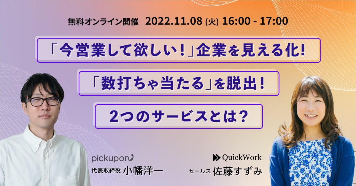 会話サマリーAI電話”pickupon(ピクポン)”を提供するpickupon株式会社(千葉県市川市、代表:小幡 洋一、以下ピクポン)は、日本全国約510万社の企業データを基盤に営業の効率化を支援する「SalesNow」を展開する株式会社QuickWork(東京都渋谷区、代表:村岡功規)と共に、オンラインセミナーを2022年11月8日(火)に開催します。