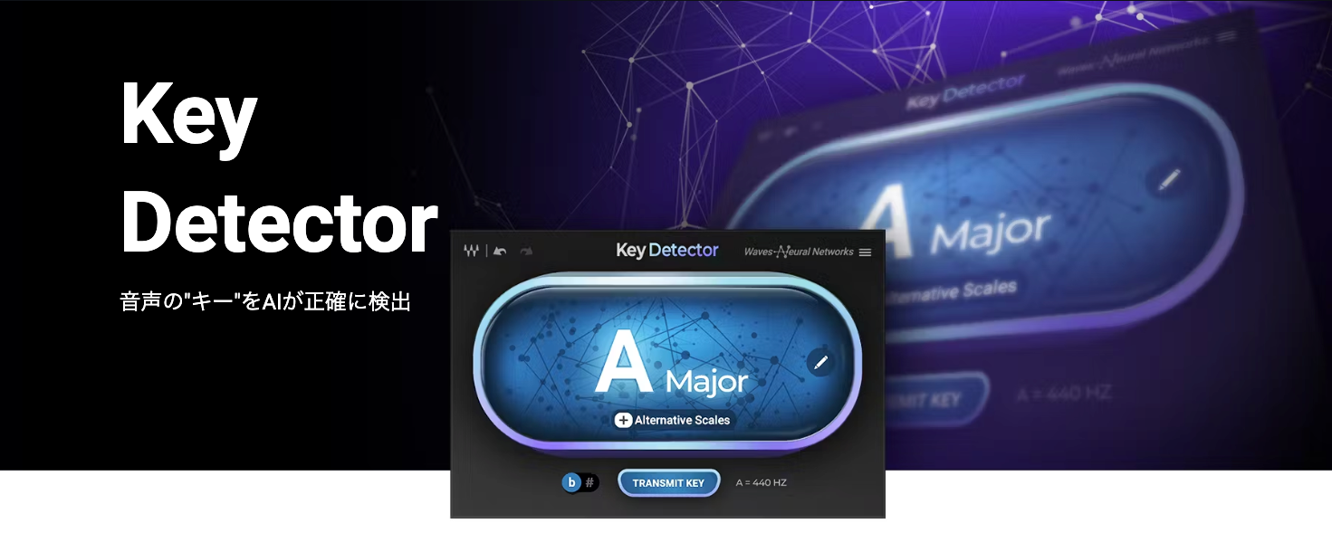 Key Detectorは強力なAI、Waves社独自のNeural Networksエンジンを搭載したMacとWindows用のプラグイン・ソフトウェアです。曲のキー(ルートノートやスケール)を自動で検出し、メジャーかマイナーかも識別し、2つの代替スケールオプションも表示してくれます。