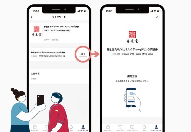 春水堂のお店にて、ドリンク交換券をスタッフに提示。