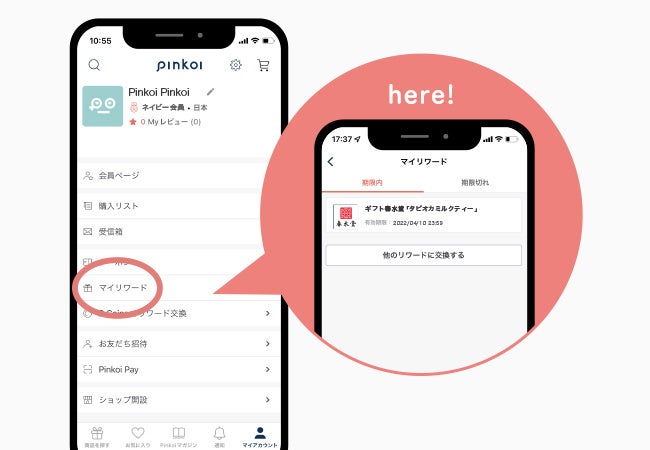 会員登録が完了すると、「マイリワード」ページにドリンク交換券が付与されます。