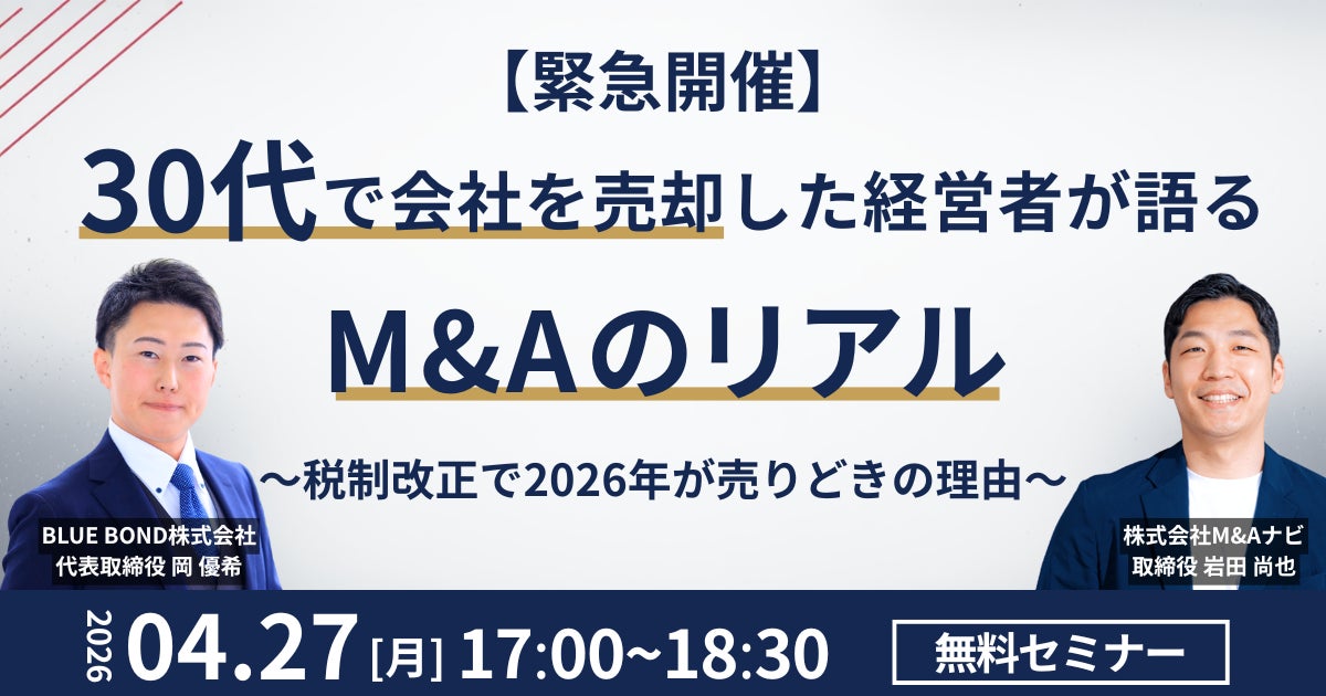 M&Aテクノロジーを展開する株式会社M&Aナビ(本社:東京都品川区、代表取締役:瀧田 雄介、以下「当社」)は、2026年4月27日(月)17:00より、オンライン無料セミナー「30代で会社を売却した経営者が語るM&Aのリアル〜税制改正で2026年が売却タイミングを検討すべき理由〜」を開催します。