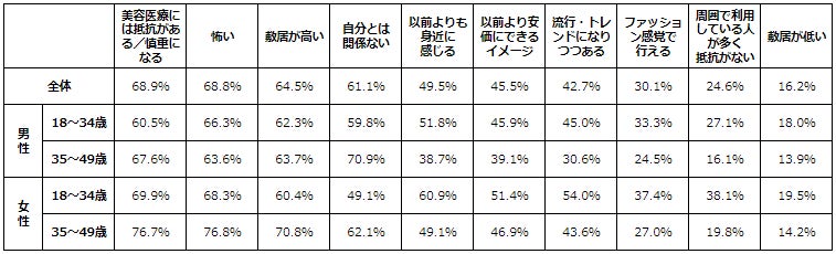 美容医療に対するイメージで高い割合を占めたのは、『抵抗がある』68.9%、『怖い』68.8%でした。やはりまだ気軽に「美容」として日常に取り入れるには少し難しい様子です。しかし、『以前よりも身近に感じる』が49.5%と、約半数の方が身近に感じ始めている傾向にあります。特に18〜34歳の女性では、60.9%と全体と比較して10ポイント程度高く、『流行・トレンドになりつつある』や『ファッション感覚で行える』『周囲で利用している人が多く抵抗がない』という回答でも、同様の結果となりました。