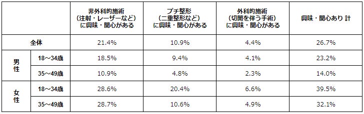 TCB東京中央美容外科が全国の18〜49歳男女を対象に『美容医療に対する意識調査』を実施。全体の26.7%が美容医療に『興味・関心がある』と回答。