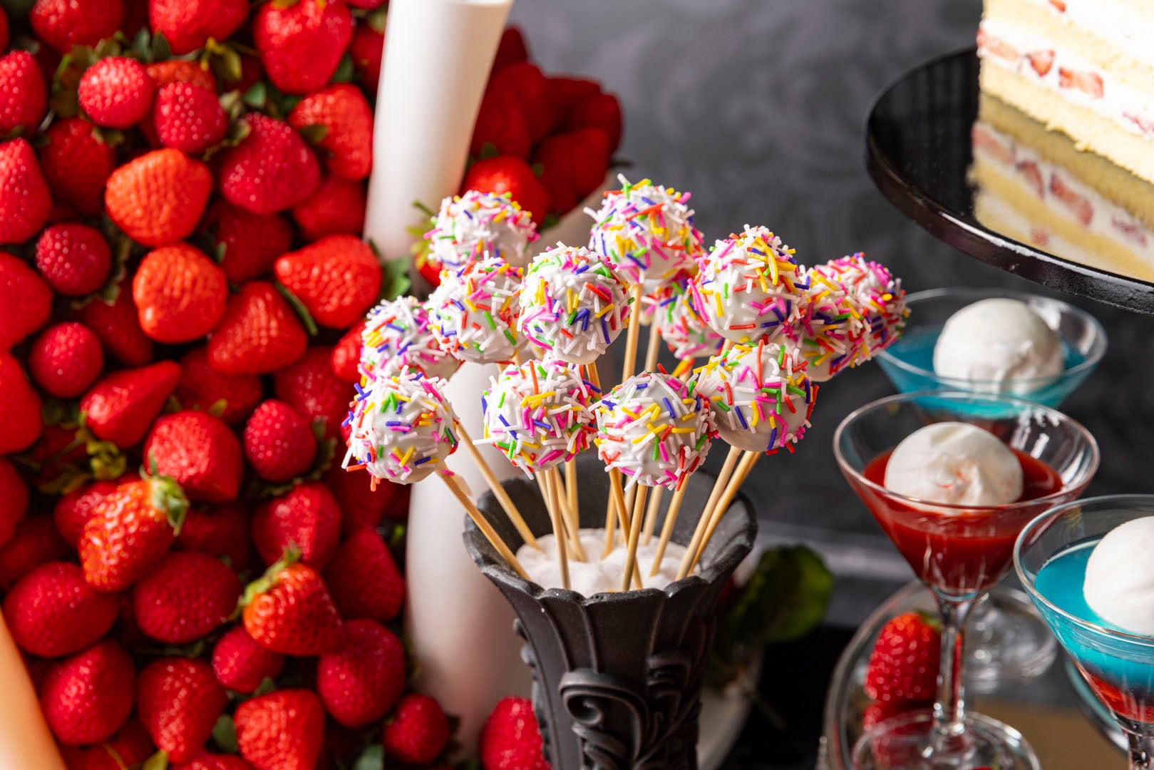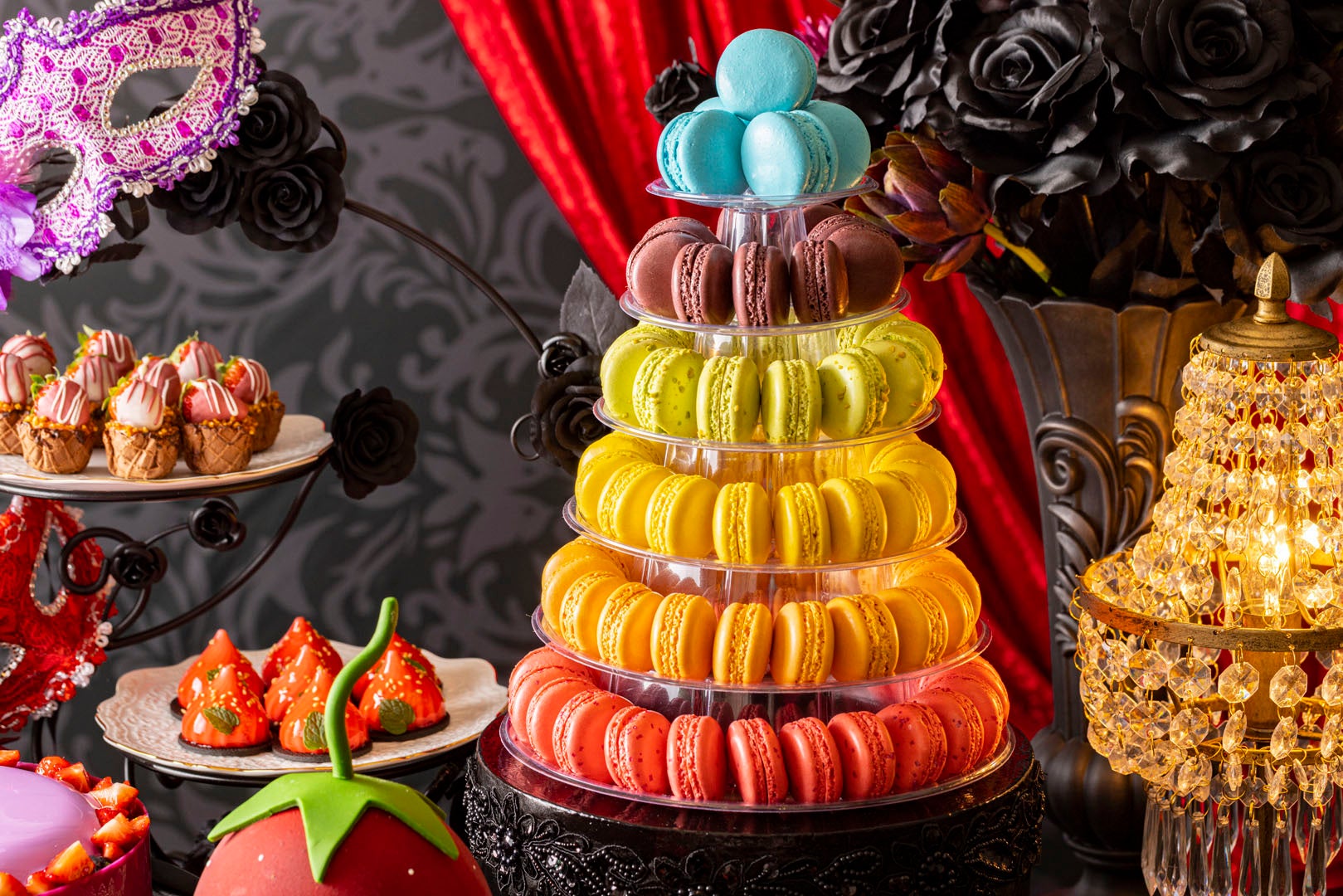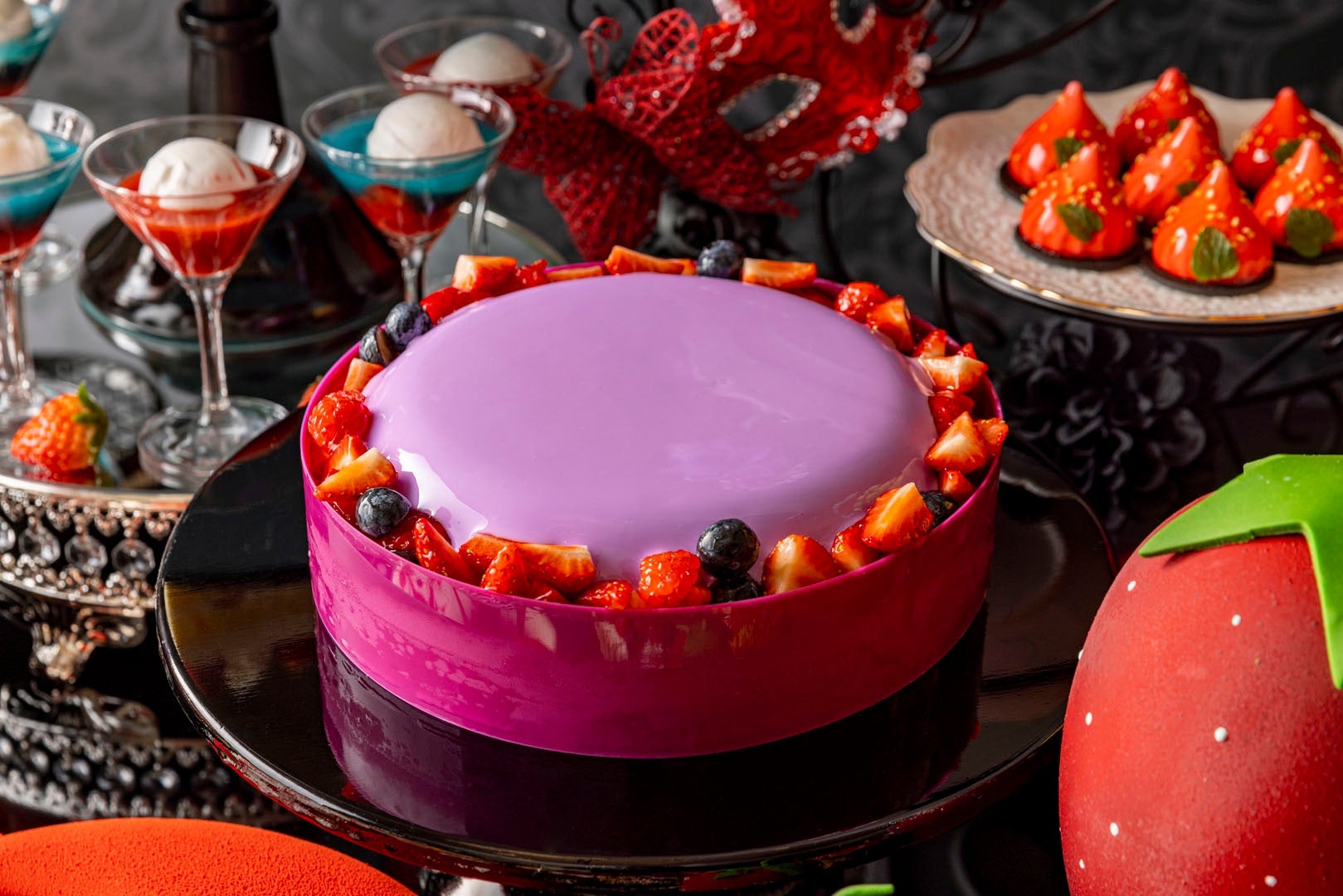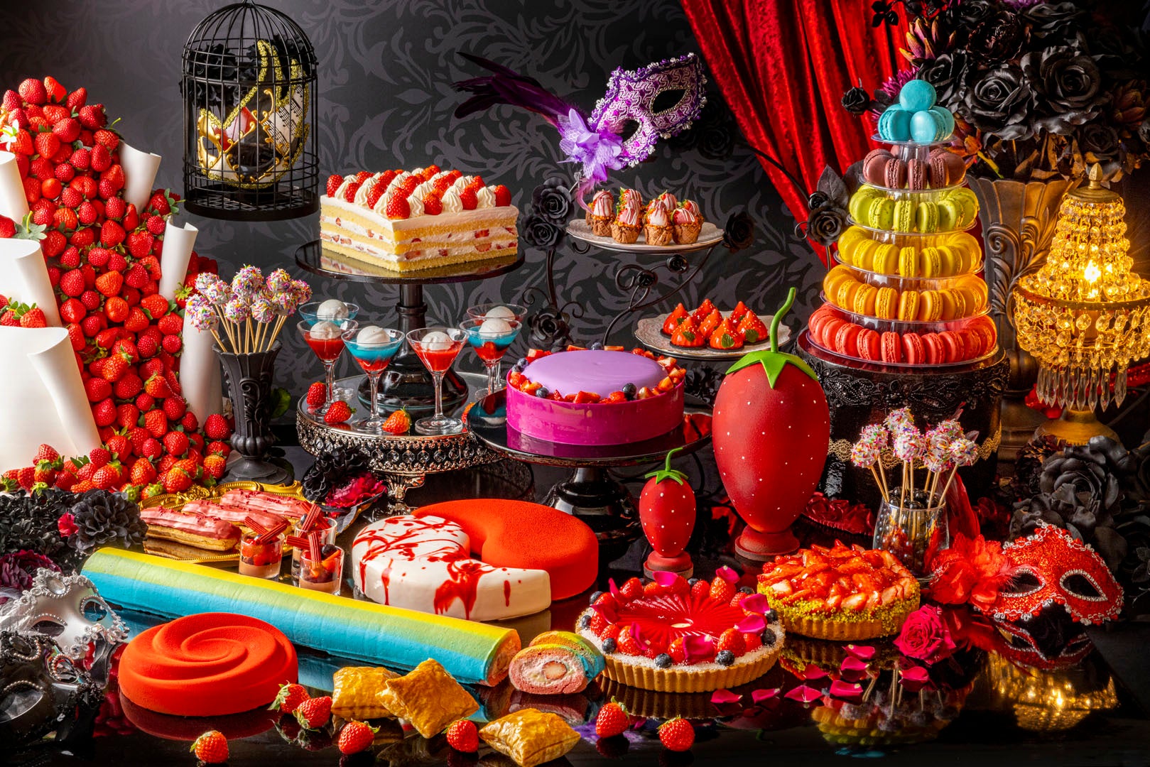 毎年ご好評をいただいている、イチゴのスイーツビュッフェ。“仮面舞踏会”をテーマに繰り広げます。マスクを付けて訪れる舞踏会は、その場にいる誰もが心をオープンにして思いきり楽しむパーティータイム。黒を基調にした仮面舞踏会の会場をイメージし、イチゴの赤色、そしてさまざまな人の個性やアイデンティティの象徴としてカラフルなレインボー色が映える「Strawberry Masquerade」。周りを気にすることなく、自分の思うままにお好きなだけスイーツをお楽しみください。