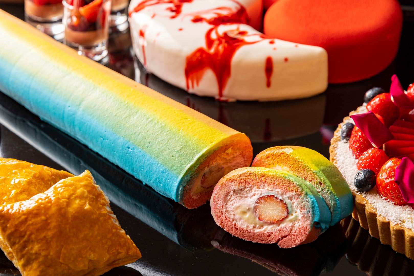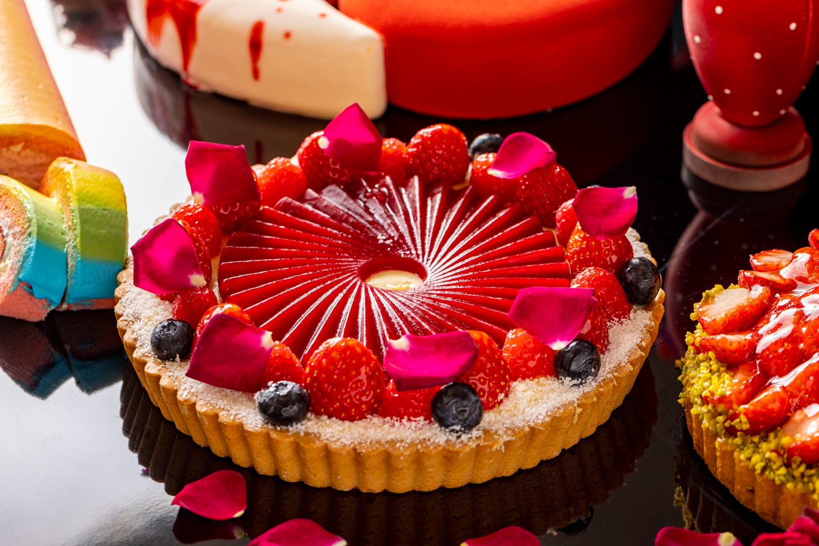 イチゴスイーツの王道「ストロベリーショートケーキ」「ストロベリータルト」をはじめ、今人気のピスタチオと組み合わせた「ストロベリー&ピスタチオムース」、ブルーベリーと組み合わせてより甘酸っぱく、華やかに仕立てた「ホワイトチョコレート&ブルーベリームース ストロベリー飾り」、イチゴを象ったデコレーションムース「ストロベリーフロマージュブランムース」、レインボーカラーのクリームを添えた「レインボーストロベリーロールケーキ」など、≪イチゴ≫という1つのフルーツをさまざまな美味しさと可愛らしさでお楽しみいただけるスイーツ18種類をご用意しました。お口直しに、セイボリー6種類もご一緒にお召し上がりいただけます。
