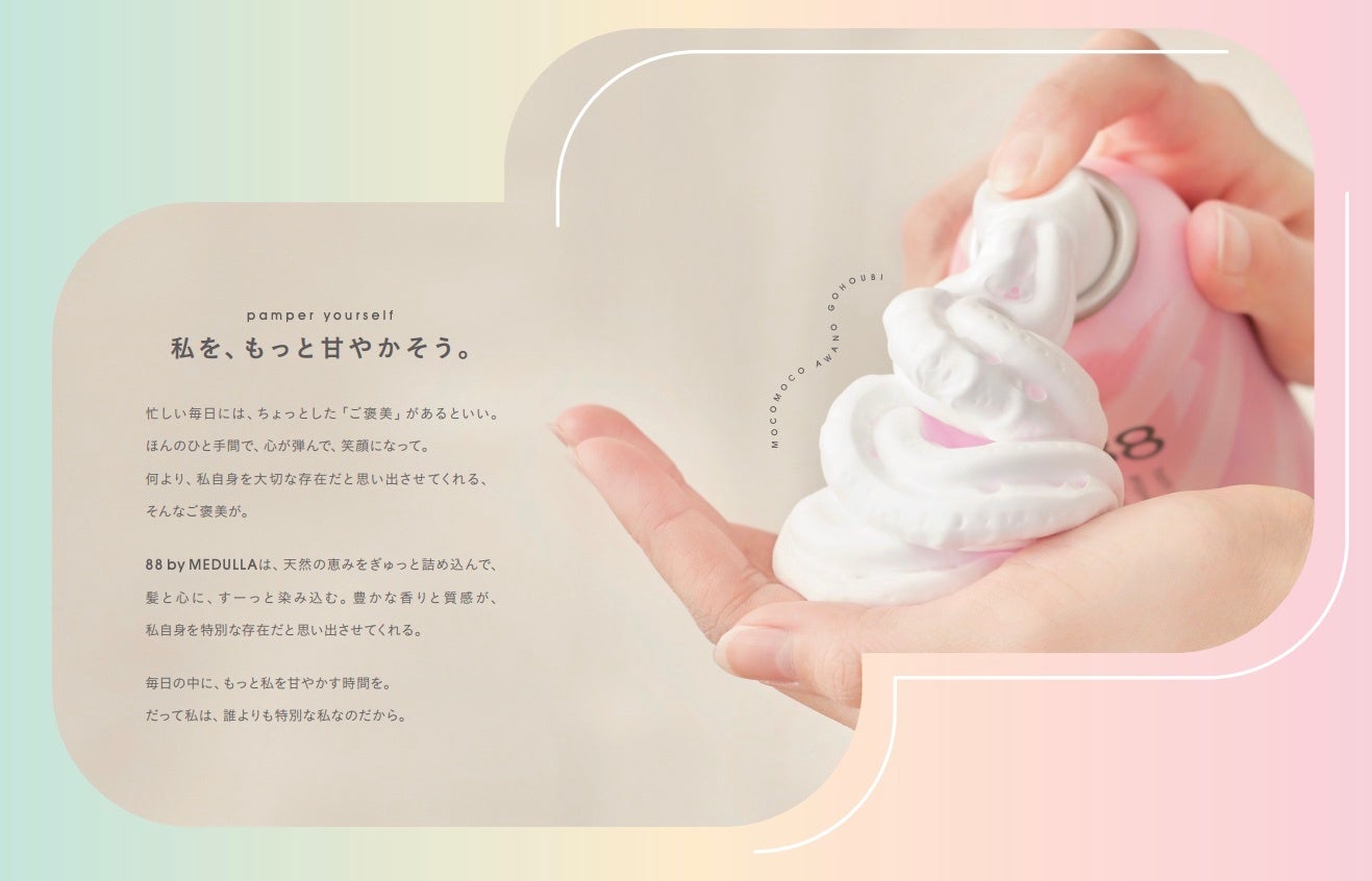 髪の「間食」をコンセプトにしたヘアケアブランド「88 by MEDULLA(ハチハチ バイ メデュラ)」誕生。スウィーツみたいな濃密泡でできたリペアブースターを3月4日(土)より販売開始。