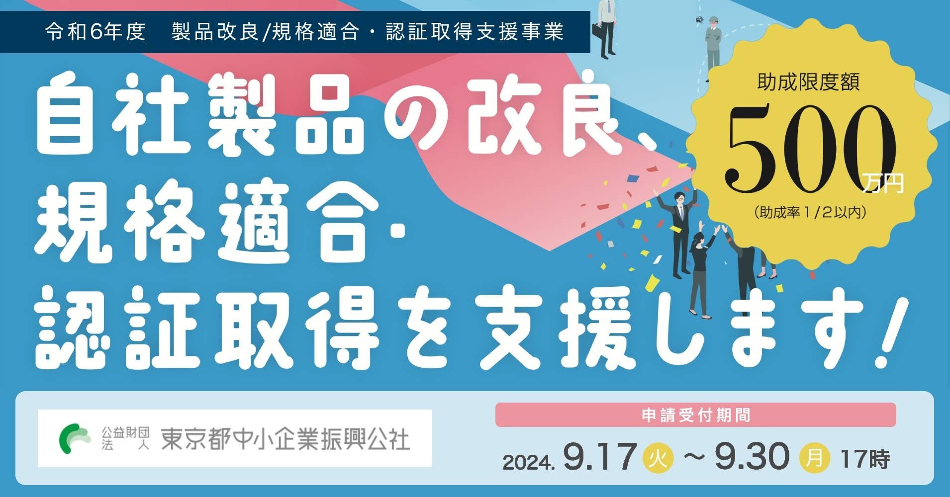 公益財団法人 東京都中小企業振興公社(本社:東京都千代田区、理事長:中西 充)は、国内外の新たな販路開拓を目指す都内中小企業者等の経営力を強化し、東京の産業の活性化を図ることを目的とする「製品改良/規格適合・認証取得支援事業」の申請を9月17日(火)から受け付けます。申請受付に先立ち、募集要項を公開しましたのでお知らせします。