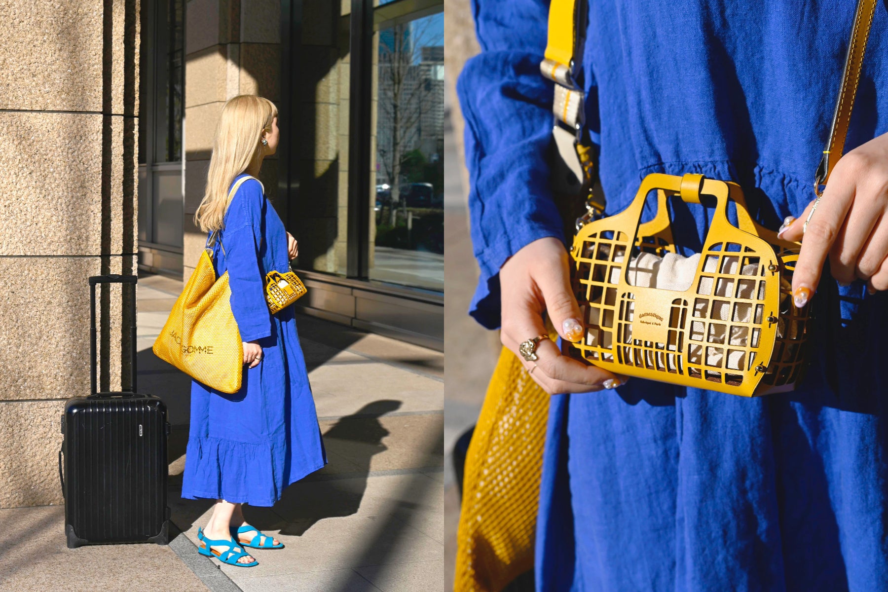 ブルーで揃えたワントーンコーデに、イエローの差し色を入れる上級者スタイル。バケーションにぴったりなジャック・ゴムのメッシュ素材バッグに、ドメスティックのマイクロバッグを合わせた2個持ちで、トレンド感を取り入れて。