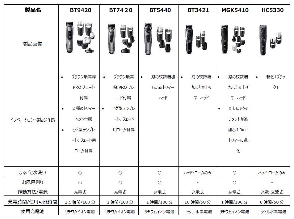 プロ仕様のBT9を最上位モデルに、BT7, BT5, BT3および、耳や鼻、ボディにも対応するマルチグルーマーMGK5を加えた5種類のラインナップとなります。