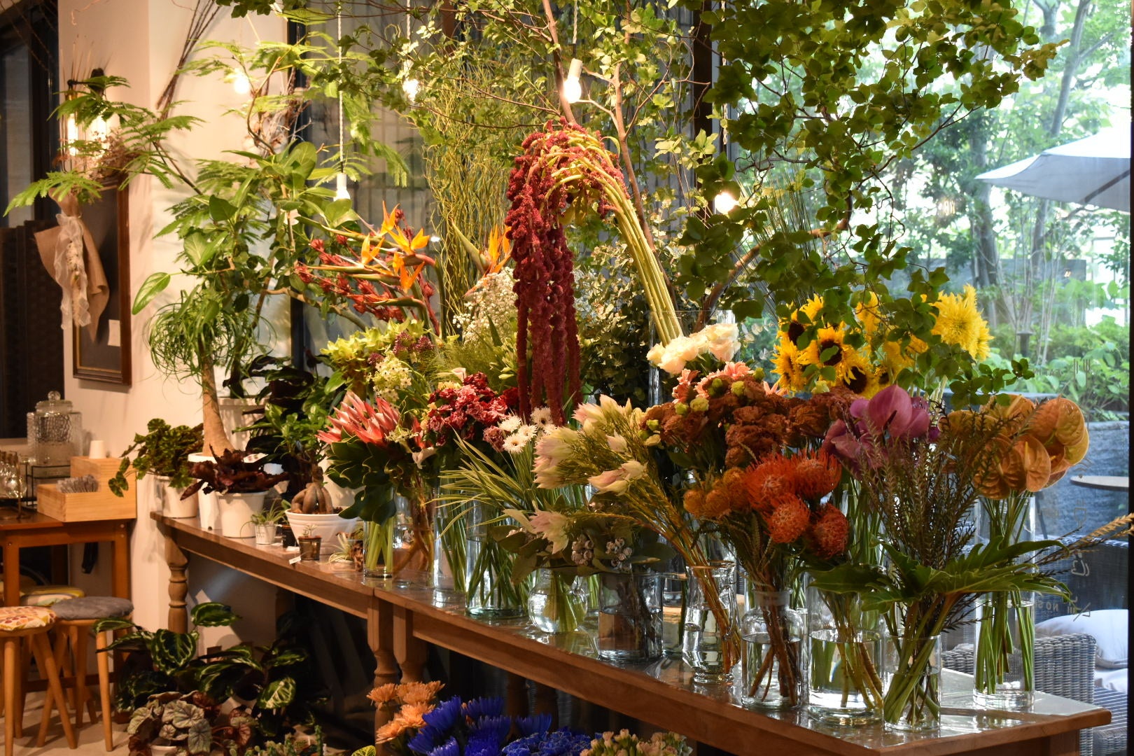 花屋には、スタッフ厳選の鮮やかなお花が並びます。