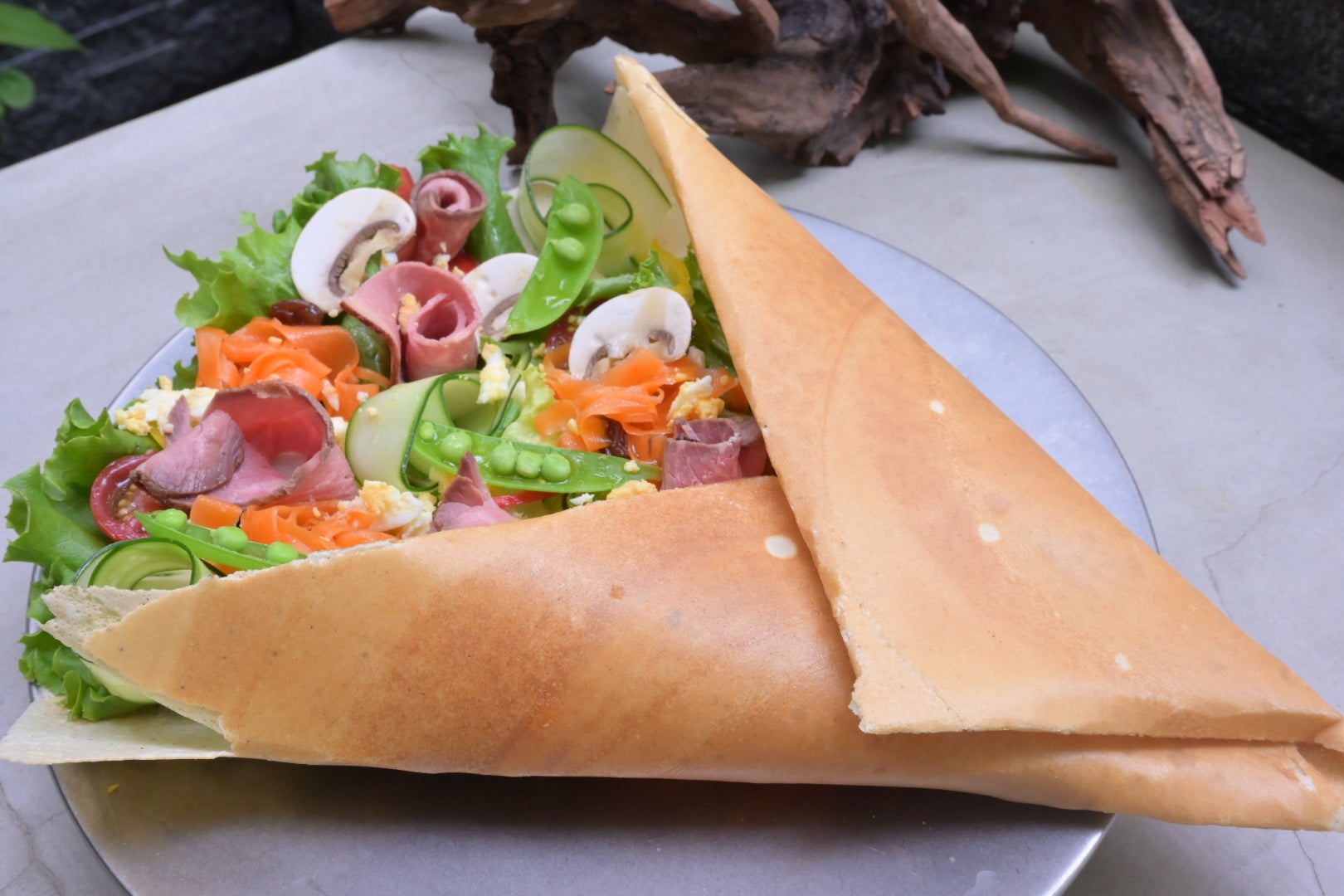 ブーケクレープは、フレッシュなパワーサラダをパリパリ食感の黄金クレープで包んだ、花束のようなクレープです。