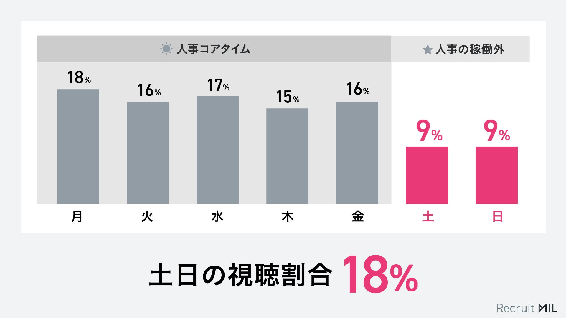 全体10,452件のうち、平日10〜18時(人事コアタイム)の視聴は4,881件(47%)。