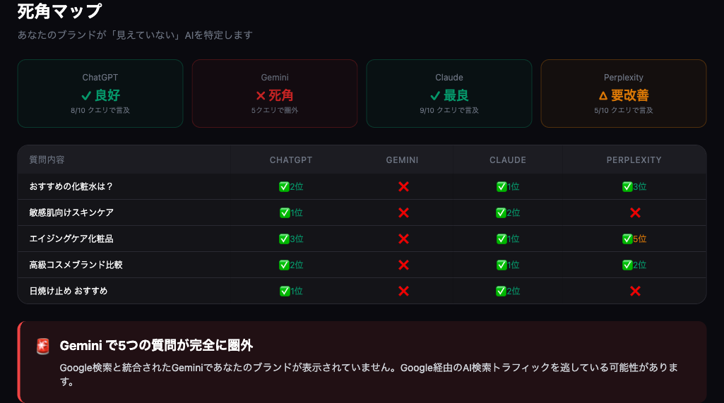 4. 死角マップ — 「このテーマはChatGPTで出るのにGeminiで出ない」を赤い警告で可視化