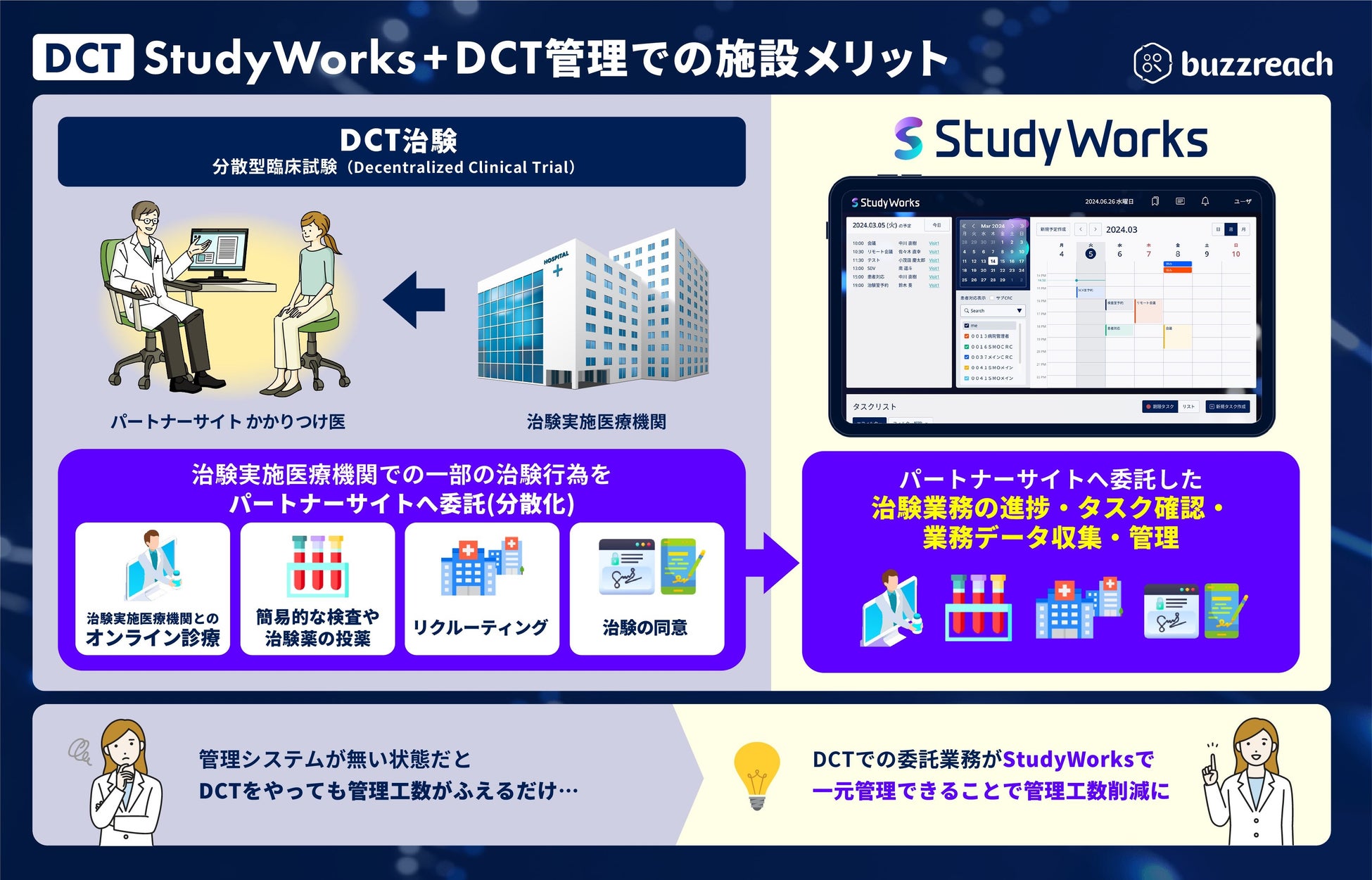 Buzzreachは、日本のドラッグラグ/ロス問題の抑止、新薬開発力向上に寄与するため「StudyWorks®︎」を全国の治験実施医療機関へ展開を進め、治験業務の効率化と品質向上に貢献してまいります。また、昨今の厚生労働省が主導する治験エコシステムで挙げられた
