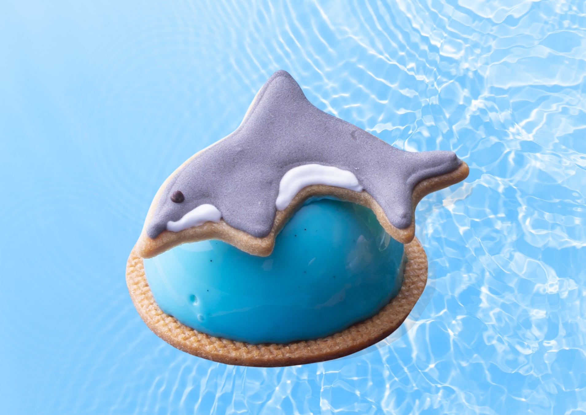 水中をダイナミックに泳ぐイルカをイメージ。中にパッションフルーツのムースが入ったケーキに、躍動感あふれるイルカのアイシングクッキーを飾りました。トロピカルな香りとともにお楽しみください。