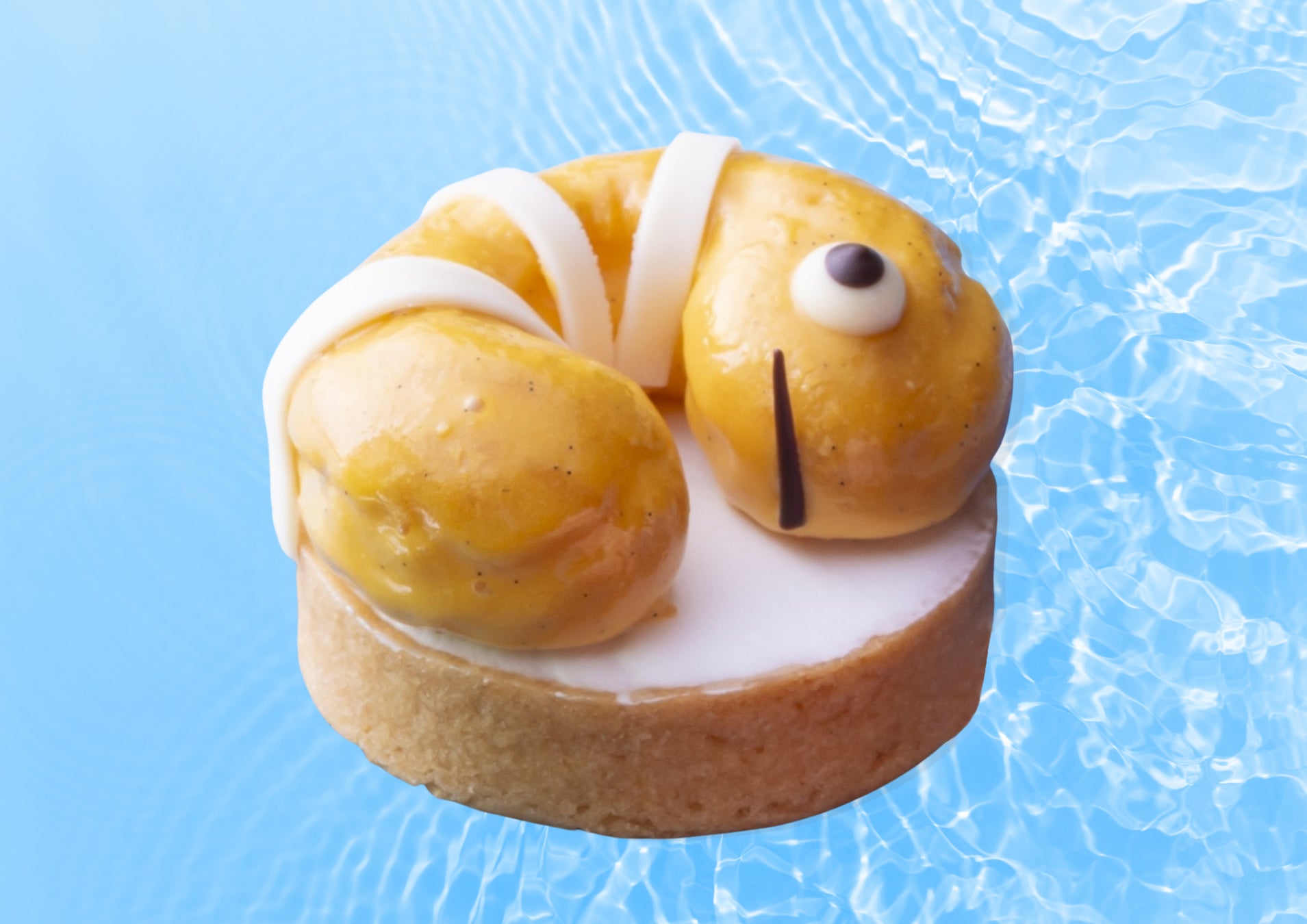 砂からひょっこり顔を出す姿がかわいらしいニシキアナゴを、シュー生地で再現。中にはマンゴークリームを詰め、バナナムースのタルトと合わせた南国風のスイーツです。