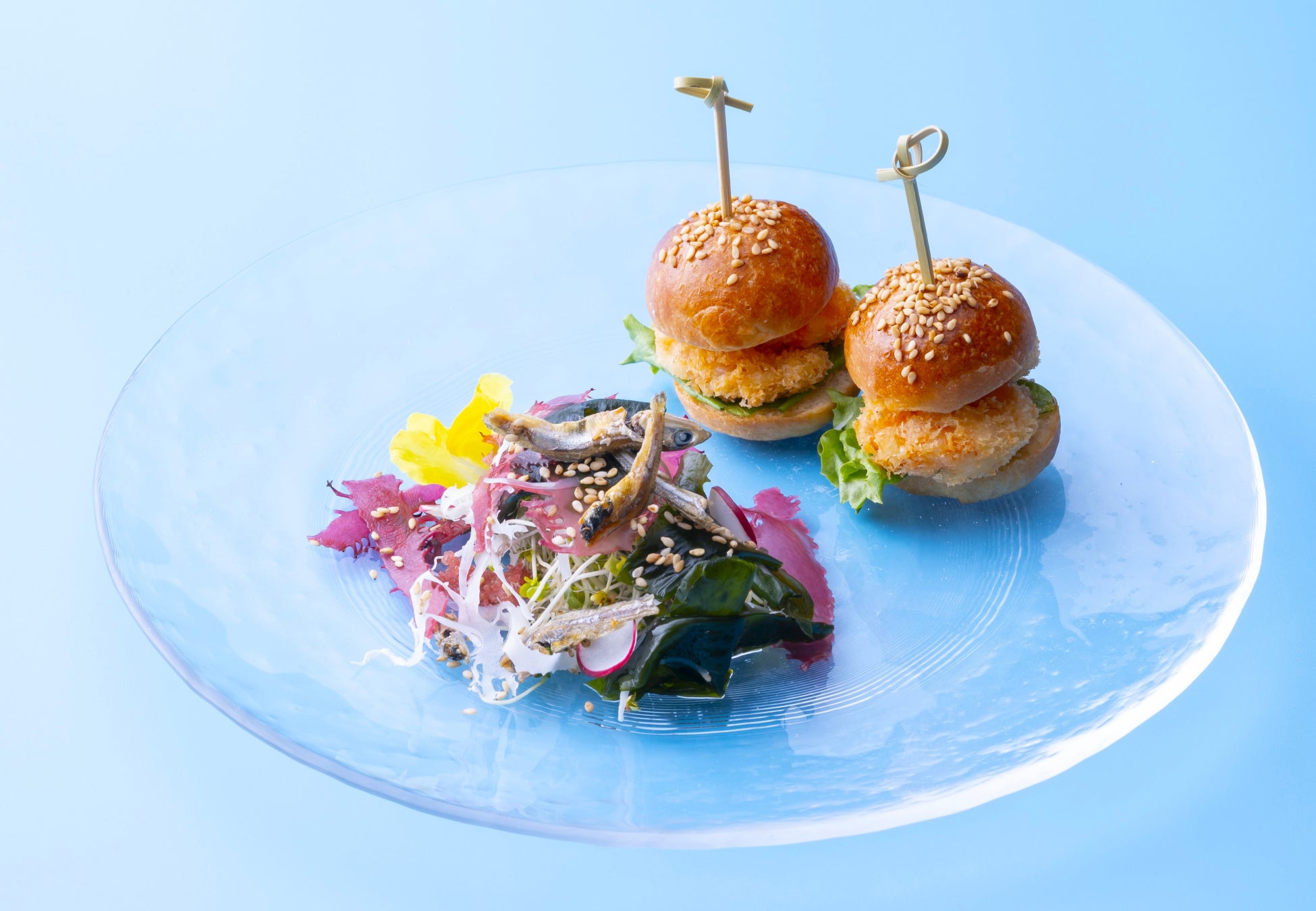 ぷりっとした海老を香ばしく揚げ、ミニブリオッシュでサンド。特製カクテルソース味でお召し上がりいただく、小さいながら食べごたえある一品です(お一人様につき2個)。