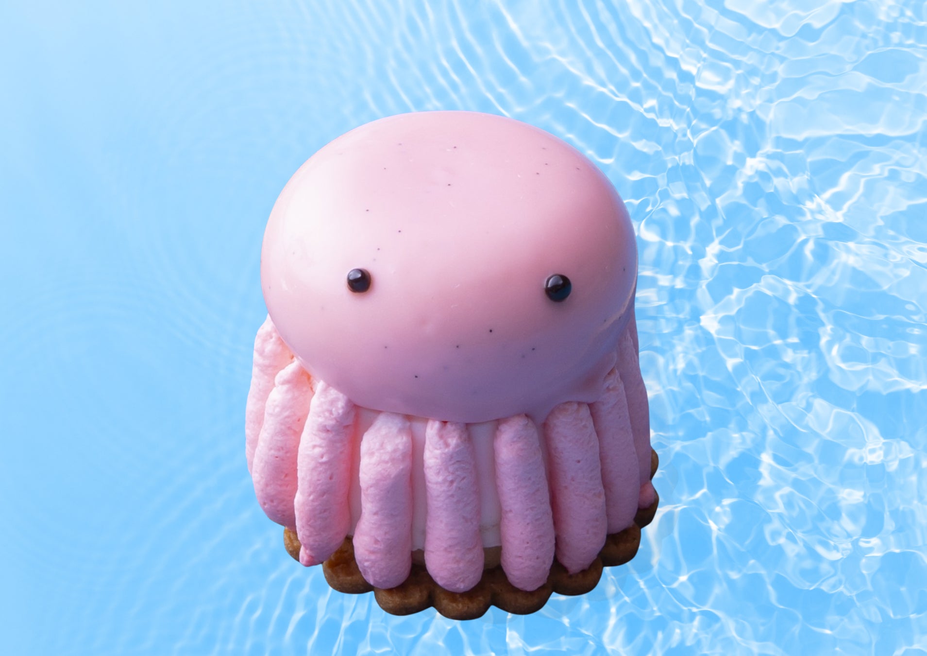 ふわふわと漂う幻想的なクラゲを、苺のムースとフロマージュブランムースで表現。やさしい甘さとさわやかな酸味が広がる、見た目も味も華やかなスイーツです。