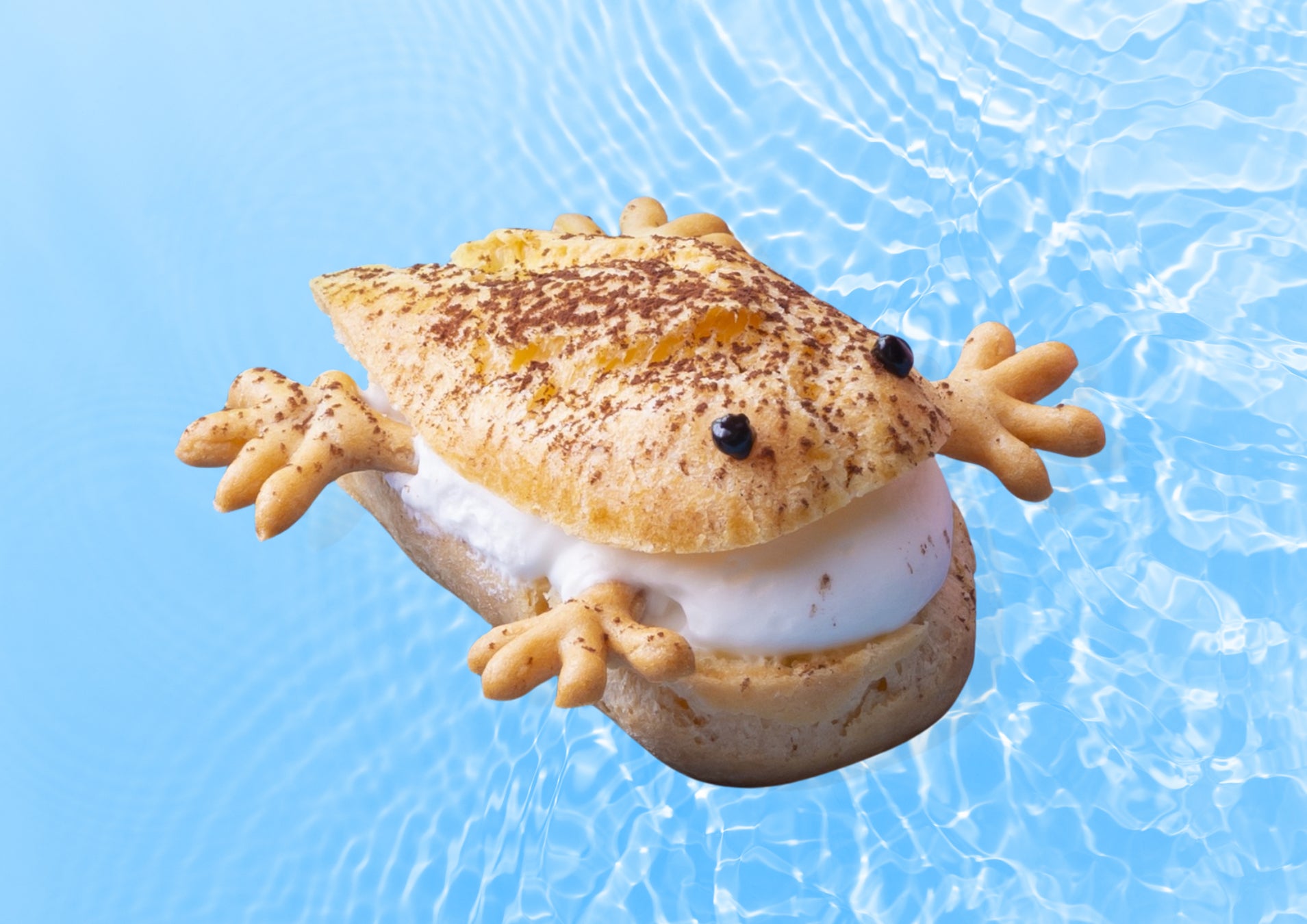 「生きた化石」とも呼ばれる、国の特別天然記念物・オオサンショウウオをモチーフにしたシュークリーム。ユニークな姿はもちろん、味もカスタードクリームとシャンティクリームがたっぷり詰まった本格派。オオサンショウウオは京都水族館でも大人気で、そのユニークな生態を間近で観察することができます。