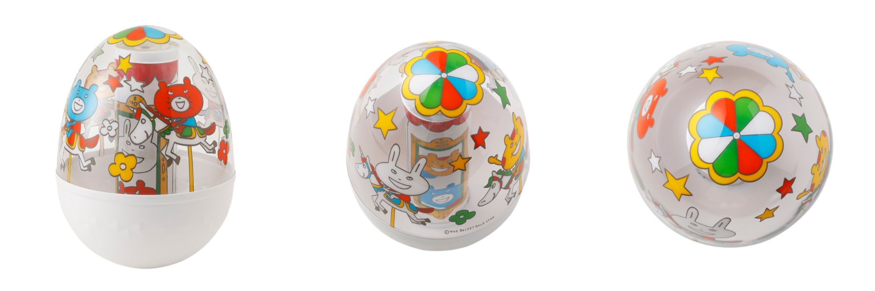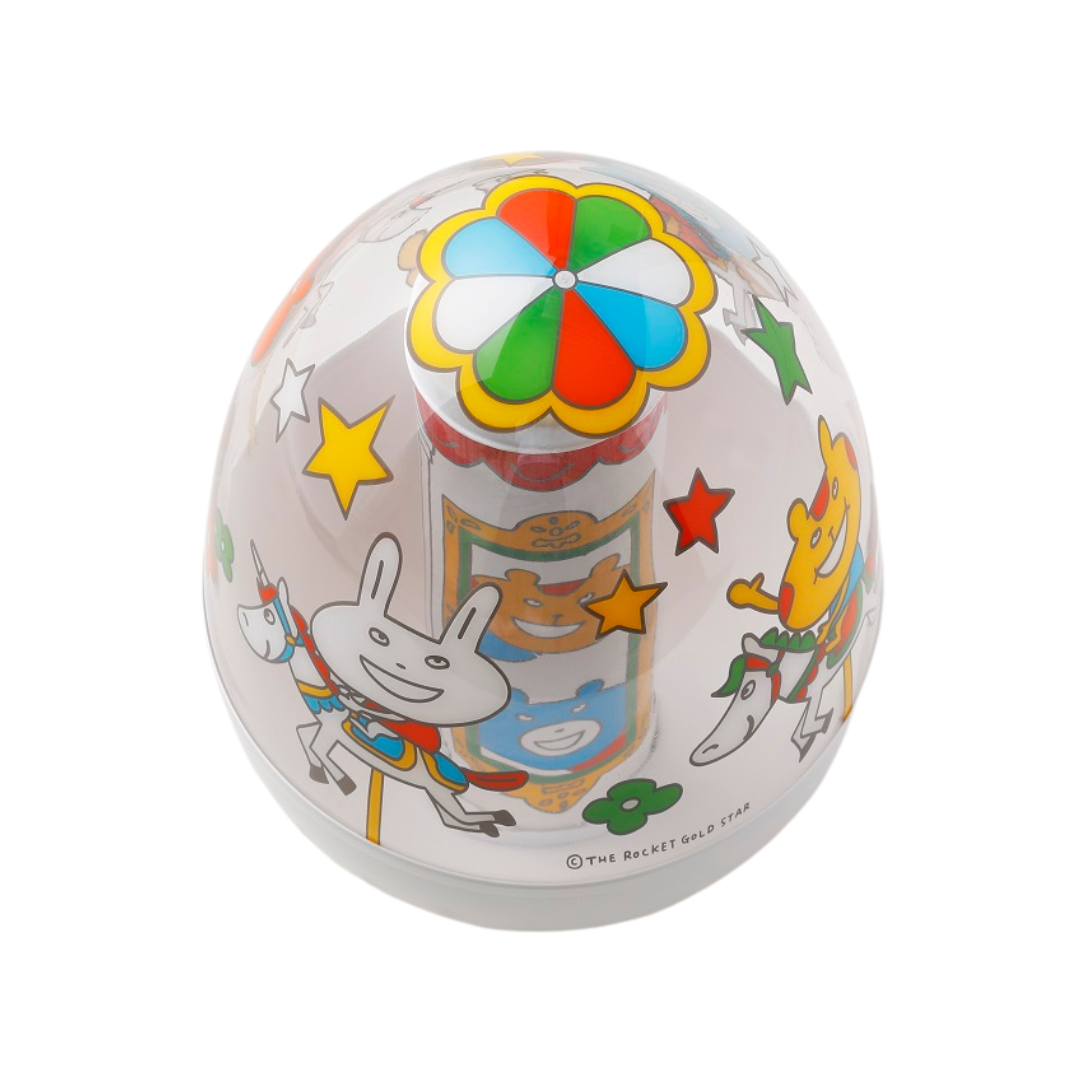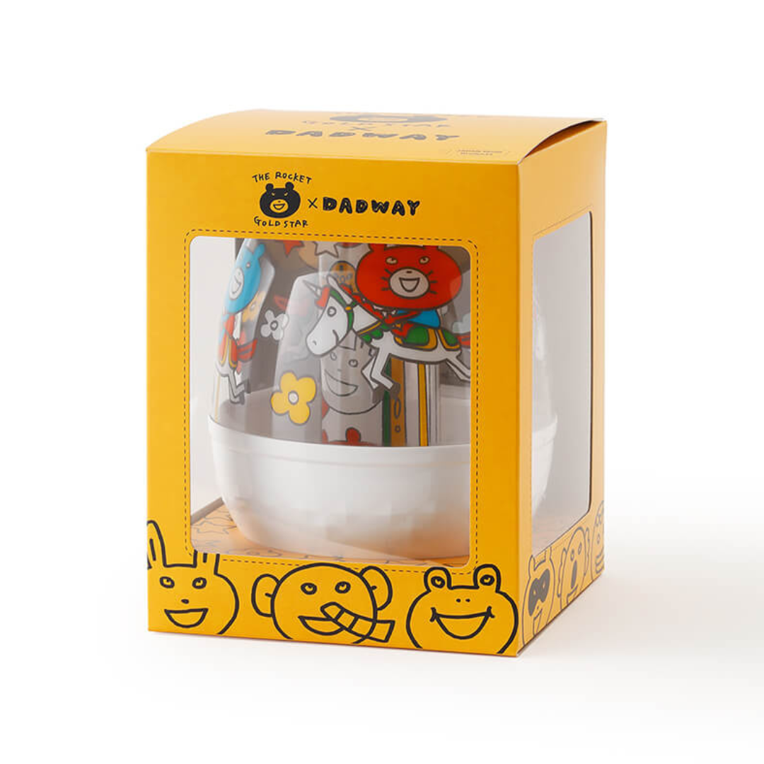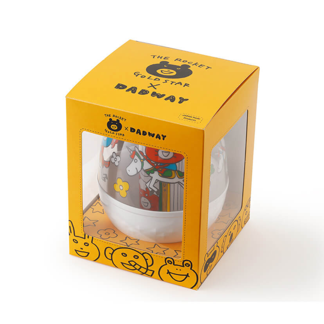 10月1日に発売したTHE ROCKET GOLD STARデザインのアパレル、ビブ、おくるみに続いて、待望のおもちゃが新登場。ダッドウェイで人気のおもちゃ「おきあがり・ムックリ」をメリーゴーランドに見立てたオリジナルデザインです。
