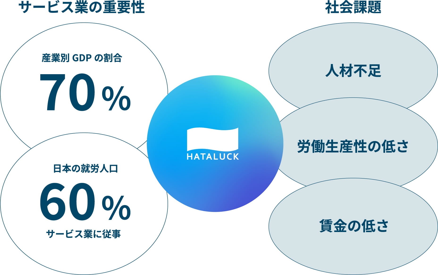 HATALUCKは、目に見えない「働きがい」をAIで可視化・データ化し、働く人々が自らの力で新たな価値を創造できる仕組みを提供します。業務効率化にとどまらず、サービス業全体を支える基盤となることを目指します。