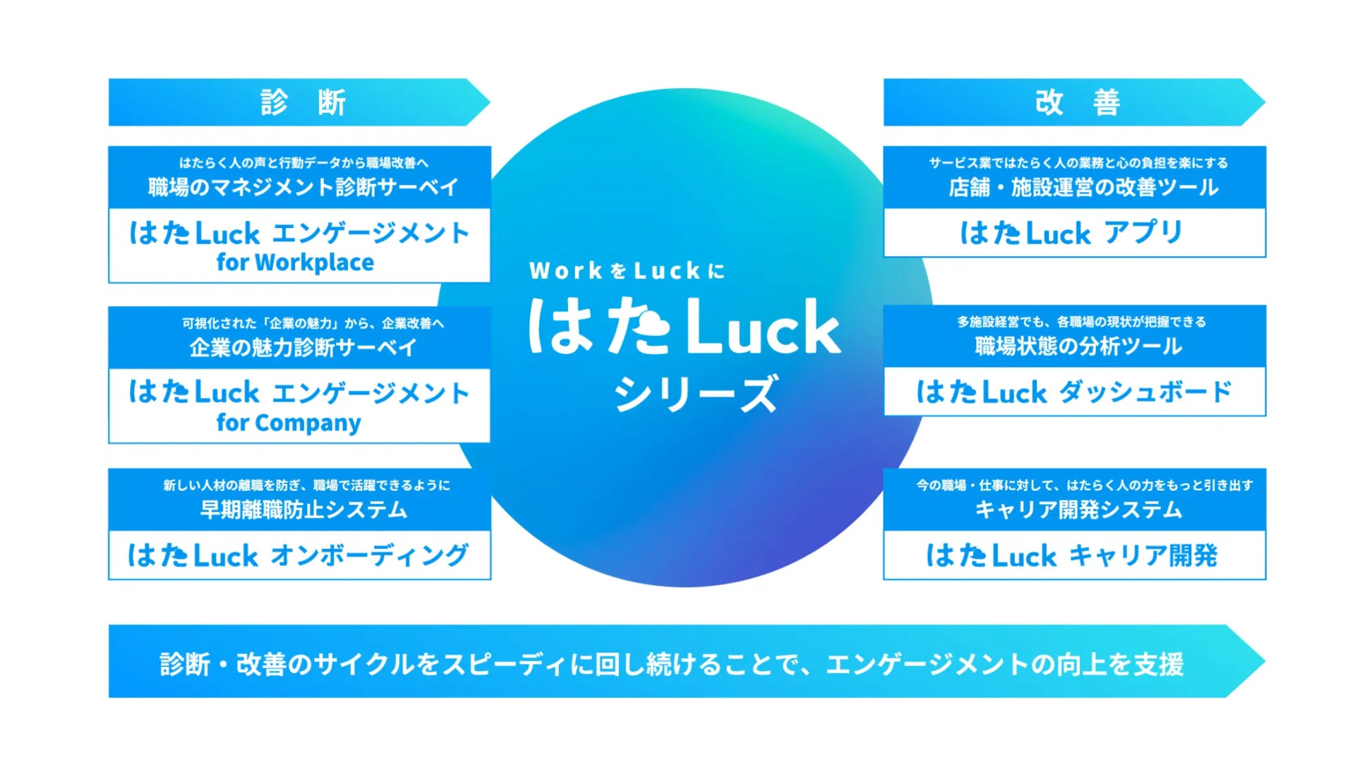 はたLuckシリーズは、店舗/職場で働く人々の「働きがい」をデータで可視化し、エンゲージメント向上を支援するプロダクトです。