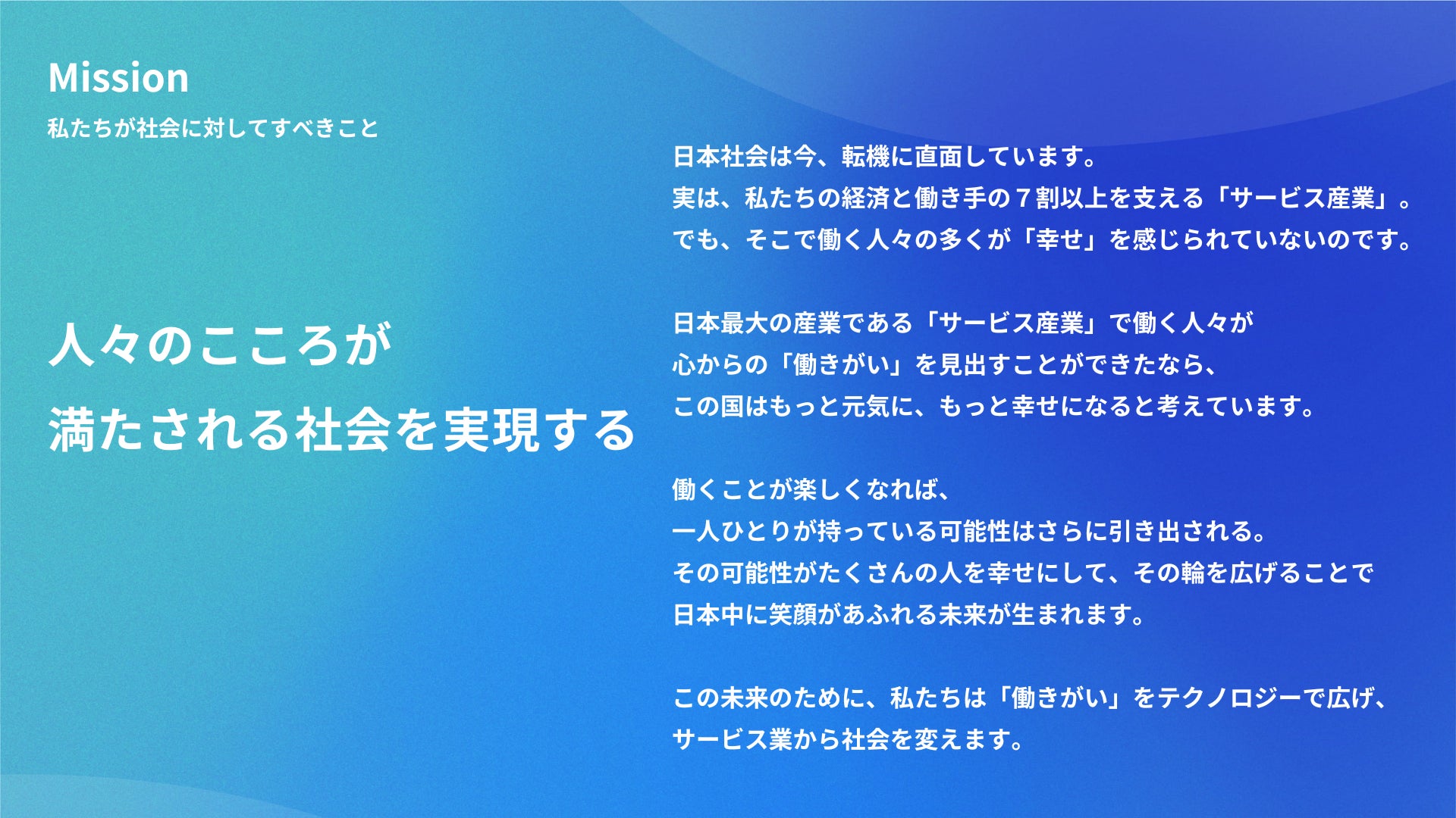 私たちは、エンゲージメント経営の推進を通じて業務DXの先へと進み、AIなどの最新テクノロジーで「はたらきがい」を科学することで働く人の力を拡張し、企業の成長支援を追求していきます。サービス業で働く人々がさらに価値を発揮し輝き、日本全体が活気づく未来を創造するために、邁進してまいります。」