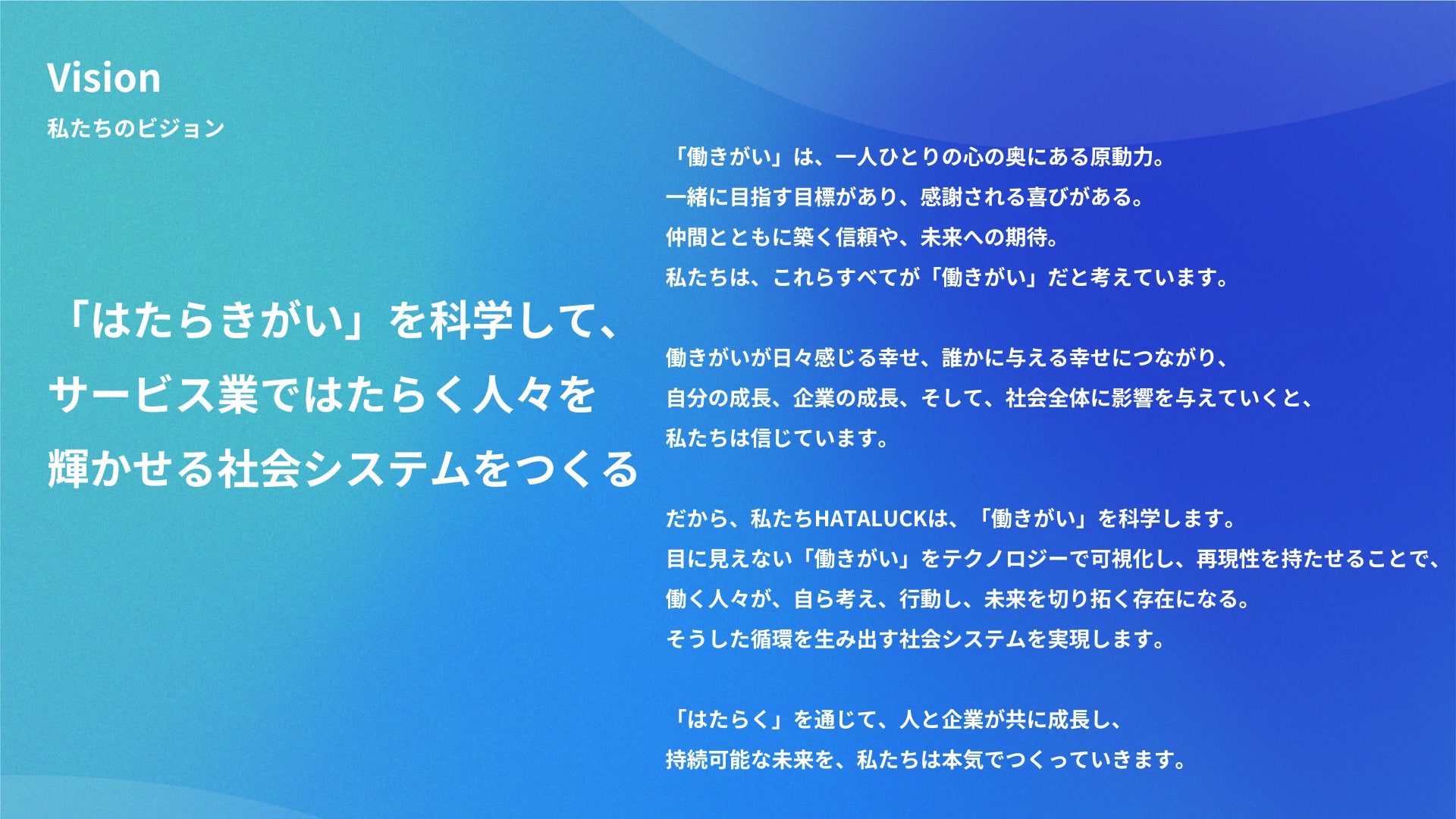 「HATALUCKは、2017年の創業以来、サービス業界の「業務」と「心」の負担に対する課題解決に取り組んできました。コロナ禍を経て、インバウンド需要が戻り日本がいよいよサービス立国、観光立国を目指す今、あらためて創業の想いに立ち返り、新たなミッションとビジョンを策定しました。