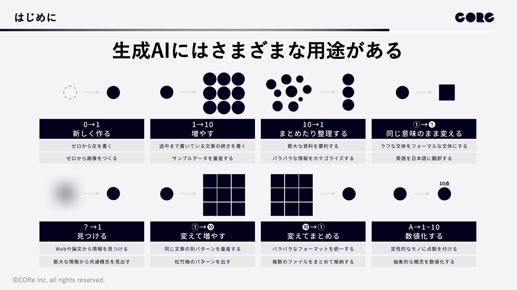 コーレは、こうした『AI活用の必要性がわからない段階』からでも丁寧に寄り添い、企業の状況に合わせて最適な支援を行ってまいります。