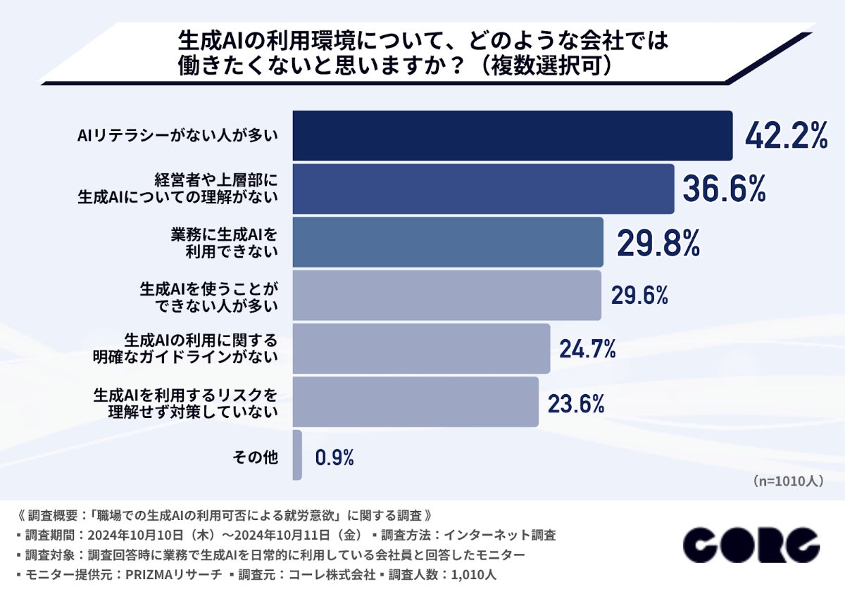 働きたくない会社の特徴TOP3は『AIリテラシーがない人が多い』『経営者や上層部に生成AIへの理解がない』『業務に生成AIを利用できない』