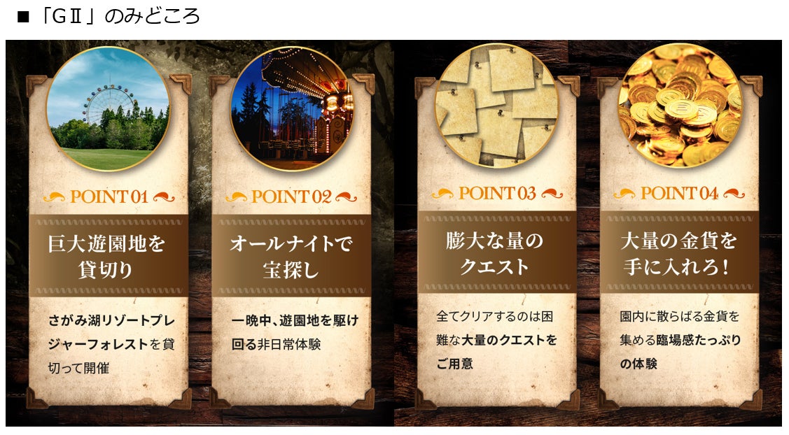 2001年4月<日本で唯一の宝探し専門会社>として発足。30万人を超える会員を保有し、累計参加者数1,000万人超のリアル宝探しは、「困難に立ち向かい、自らの手で宝を見つけ出す」という成功体験を通じて非日常的な感動が味わえる、唯一無二の体験型プログラムです。