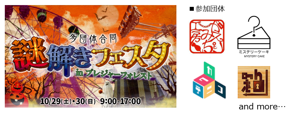 本イベントに合わせて多団体合同「謎解きフェスタ in さがみ湖リゾート プレジャーフォレスト」も実施いたします。大型テーマパークでの謎解き団体による合同フェスティバルは過去前例がなく、謎解きファンだけでなく初心者の方にもお勧めのイベントです。