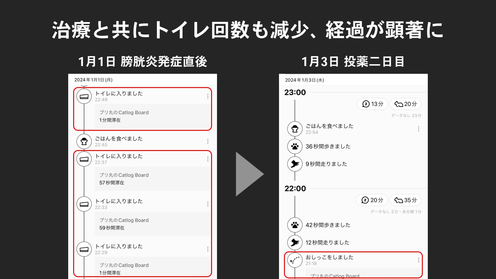 RABOのCCO(Chief Cat Officer)であるブリ丸もCatlog Boardを利用しています。昨年末、ブリ丸のトイレ入室回数が増加したことをCatlog Boardがアラートで知らせたため、速やかに動物病院に連れて行ったところ、膀胱炎と診断されました。年末で飼い主が家にいたにも関わらず、ブリ丸が頻繁にトイレには入るものの排尿していないことには気づいていませんでした。このように、たとえ飼い主さんが在宅だったとしても、排泄状況が異常であることを早期に把握・発見することは非常に困難です。Catlog Boardはいつものトイレの下に敷くだけで、自動で記録をおこない、ブリ丸の例のような泌尿器疾患などの異常に見逃しやすい段階で気づいて対処することが出来ます。