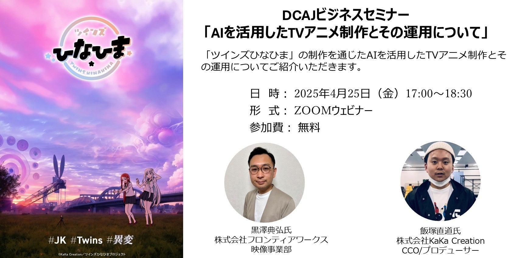 2025年4月25日(金)17:00より株式会社フロンティアワークスの黒澤氏および株式会社KaKa Creationの飯塚氏を講師に迎え、「ツインズひなひま」の制作を通じた生成AIの実践的な活用事例についてご紹介いただくDCAJビジネスセミナー「AIを活用したTVアニメ制作とその運用について」をオンラインで開催いたします。本セミナーでは、以下のポイントについて解説いたします。