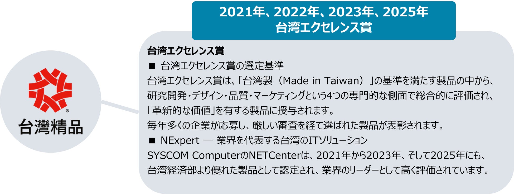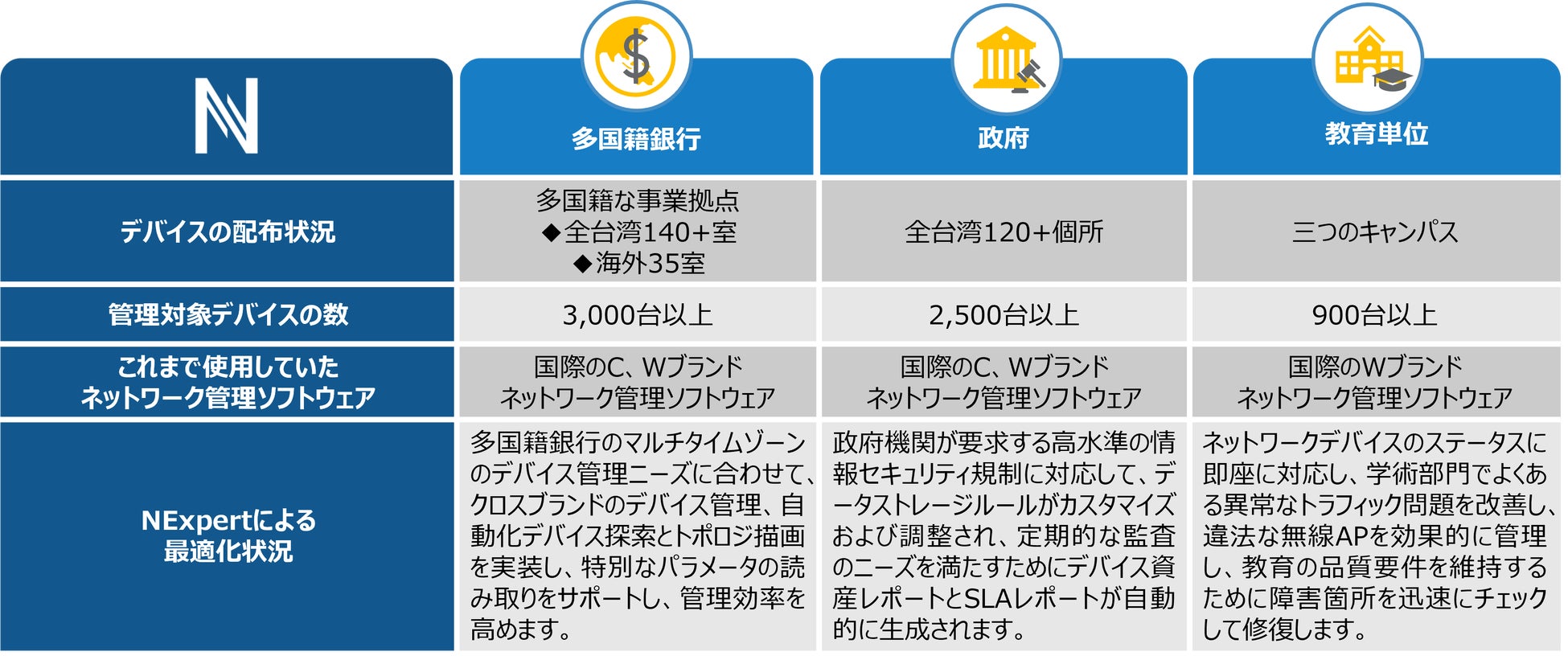 「NExpert」は、すでに様々な業界でご利用いただいており、特に台湾では高いサービスレベルが求められる金融・保険業界、政府機関、IT企業などで多数導入されています。また、革新的で優れた台湾製品に授与される台湾エクセレンス賞を4度受賞するなどIT監視プラットフォームとしての性能と信頼性は高く評価されています。