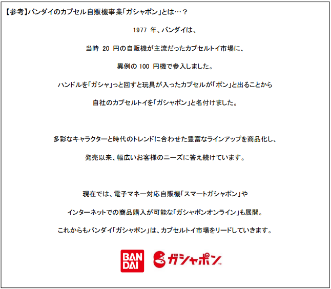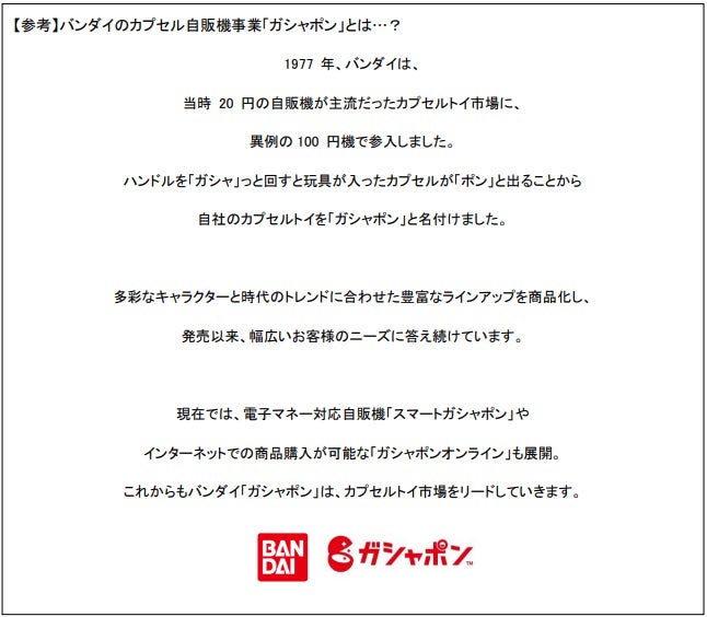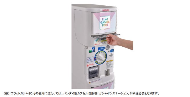 「フラットガシャポン」は、既存のカプセル自販機(※)の商品補填カートリッジ(オプションケース)を交換する こと で、最大 A4 サイズ、厚み 1cm までの平面商材が販売可能になる、バンダイ「ガシャポン」45 年史上初 のガシャポンマシンです。何が出てくるか分からないガシャポンの「ドキドキ・ワクワク」はそのままに、サイズや 厚みのバリエーション豊かな商材が販売可能です。