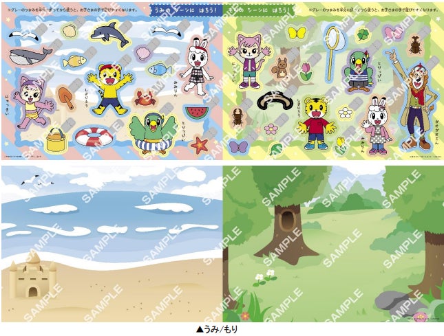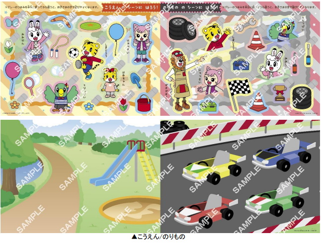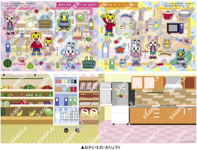台紙は日常生活や子どもたちが好きなものをテーマにしており、1 セットで 2 つのシチュエーション でシール遊びが楽しめます。開くと全幅約 588mm の A4 サイズ約 2 枚分のボリューム感も大きな 魅力です。シールはキャラクターやアイテムがダイカットになっており、子どもの手でも取りやすい ように小さなつまみが付いた遊びやすい仕様になっています。