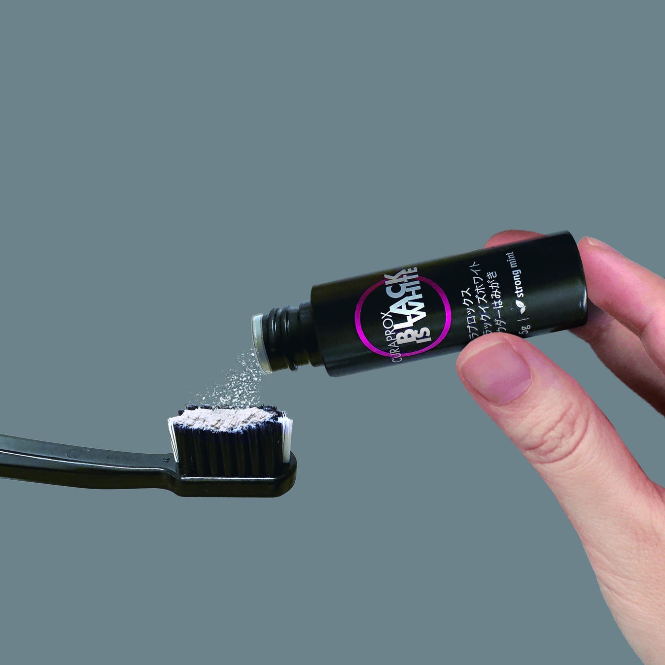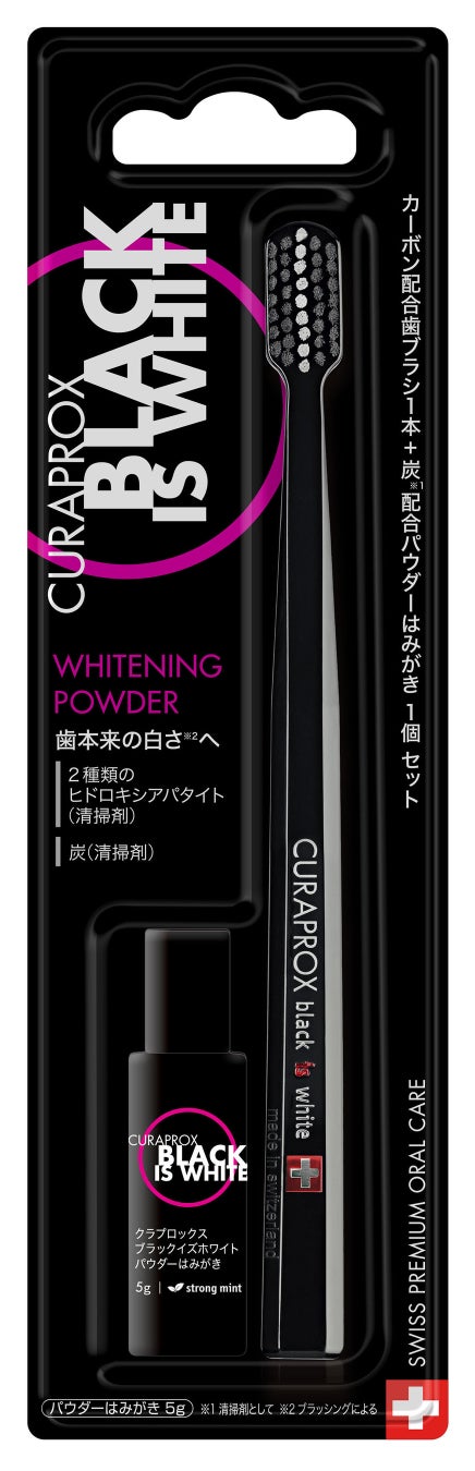 新商品パウダーはみがき5gと、歯の汚れをやさしくしっかり取り除く「クーレン🄬繊維」に「カーボン」を配合した人気のブラックイズホワイト 歯ブラシ(黒)とのセットです。スタイリッシュなデザインの歯ブラシとパウダーはみがきの組み合わせで毎日の歯みがきが楽しくなります。