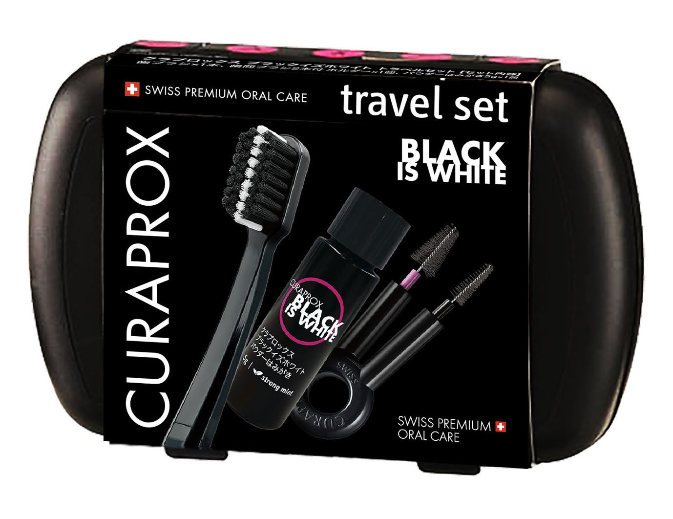 新商品パウダーはみがき5gとブラックイズホワイト 歯ブラシ(黒)、そして形状の異なる2種類の歯間ブラシが付いた歯間ブラシホルダーの3点セットです。お出かけ先での歯みがきにも隅々まですっきり爽快な使用感をお楽しみいただけます。
