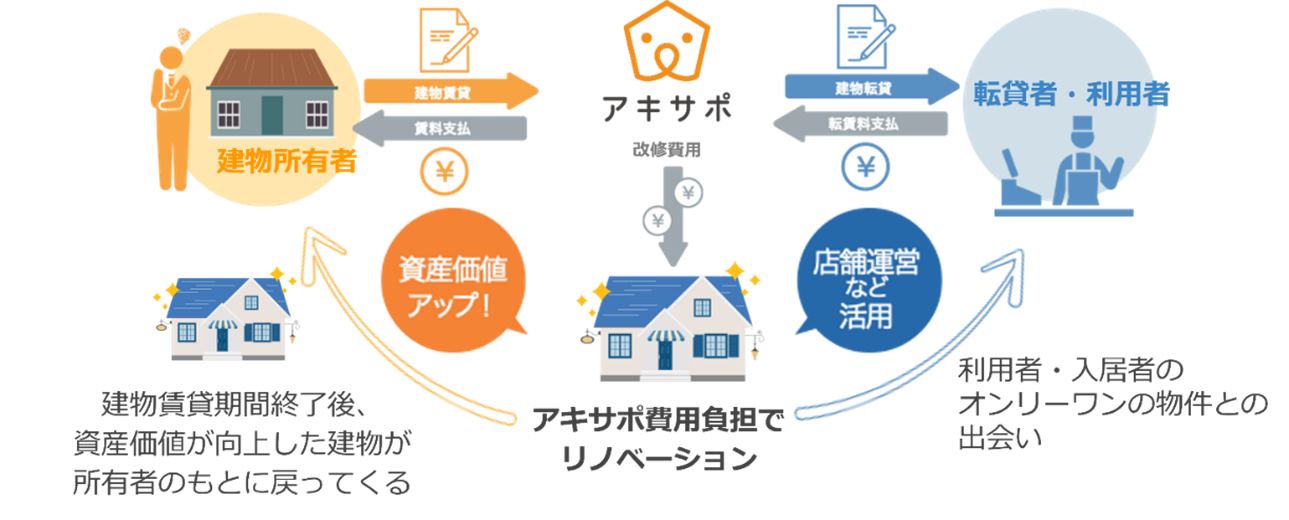 空き家を「アキサポ」が借り受け、「アキサポ」全額費用負担でリノベーション工事を行い、一定期間転借するサービスです。地域にマッチした空き家活用を提案することで街の資源である空き家の再生を通じて地域コミュニティの活性化に貢献しております。また、「アキサポ」は全国の空き家問題を解決するべく、全国各地の不動産会社や工務店などの空き家活用事業者とライセンス契約を結び、アキサポネットを形成し提携しております。