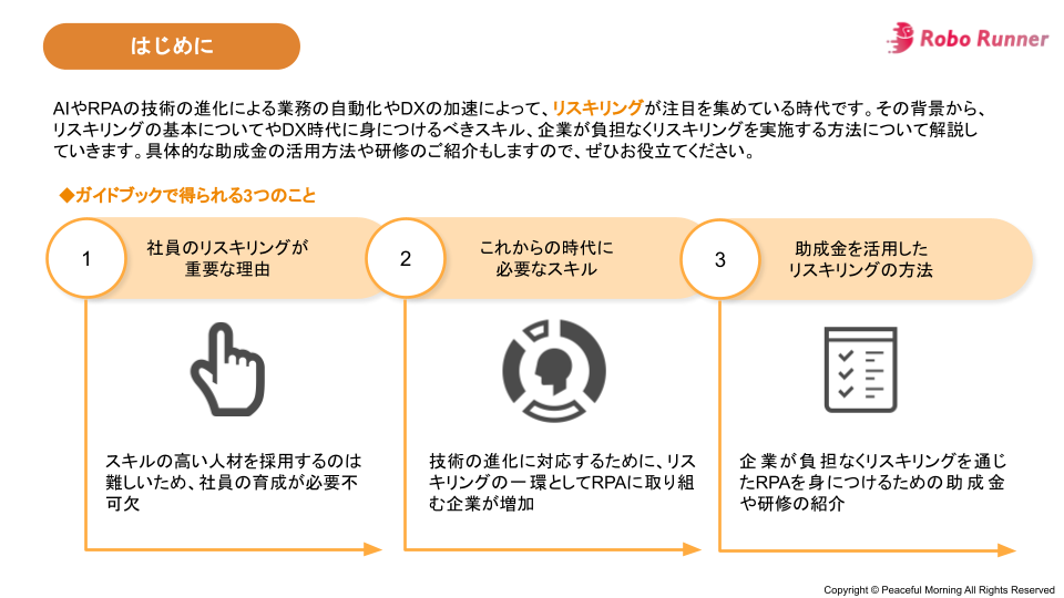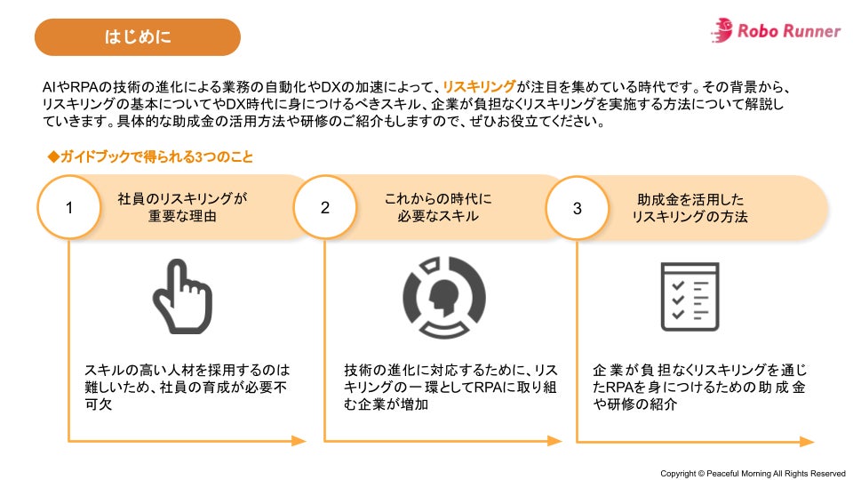 本ガイドブックは、これからの時代に必要なスキルや助成金を活用したリスキリング研修についてまとめています。ご予算内でのリスキリング研修を検討されている管理職や人事担当者、情報システム部門の方など、ぜひお役立てください。
